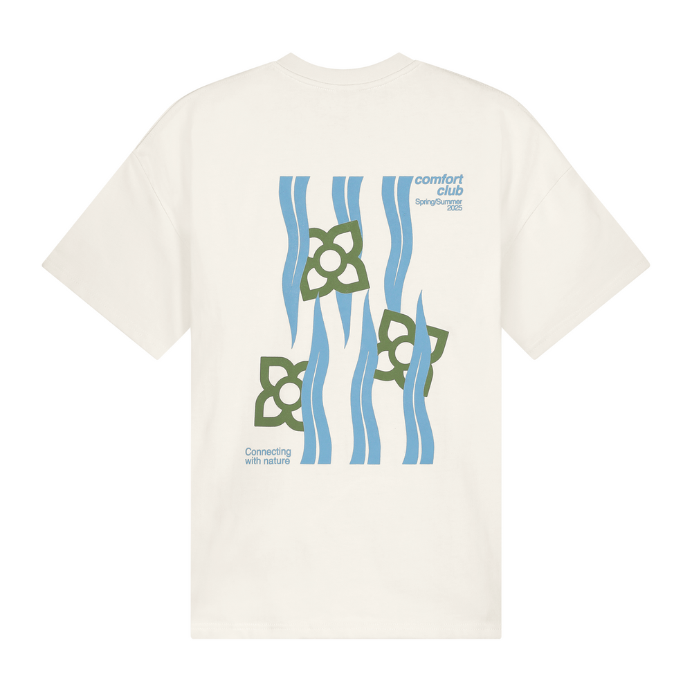 Short sleeve jersey t-shirt in off white. Slightly oversized fit in a medium weight cotton. Ribbed crewneck collar. Comfort Club Algea print graphic to the chest and back.