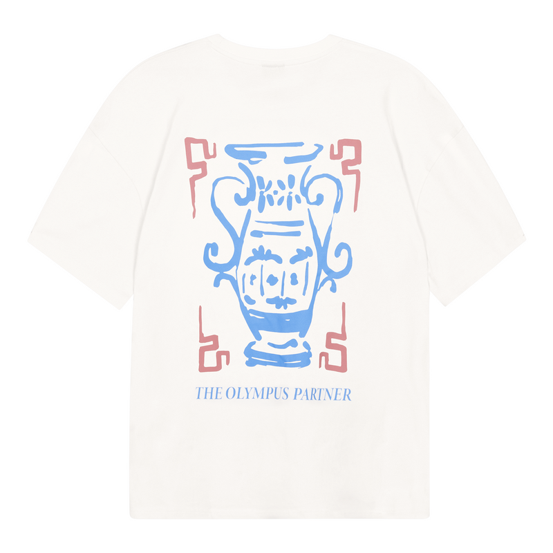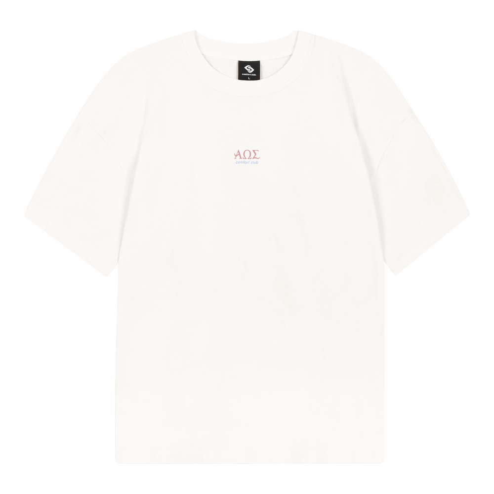Short sleeve jersey t-shirt in Off White. Slightly oversized fit in a medium weight cotton. Ribbed crewneck collar. Comfort Club Amphora print graphic to the chest and back.