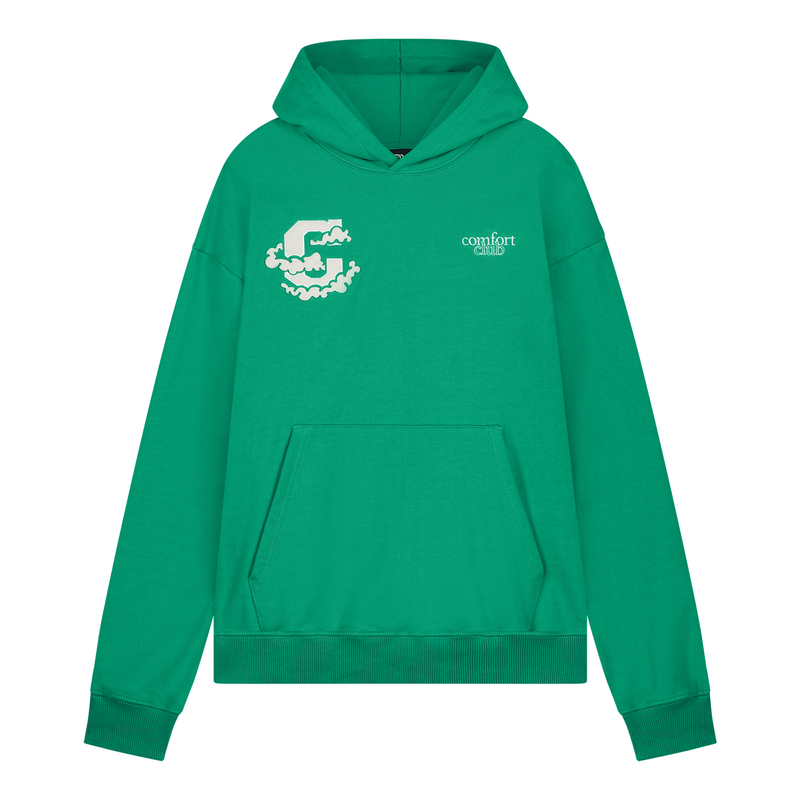 Leaf Green hoodie with a slightly oversized fit in a heavy weight jersey cotton. Super soft, pre-shrunk and piece dyed for the ultimate jersey. Ribbed hem & cuffs. Comfort Club Celestial Cloud graphic print / applique to the chest & back.