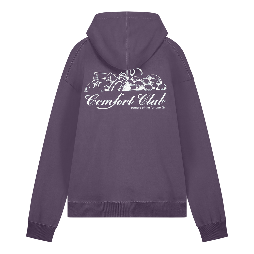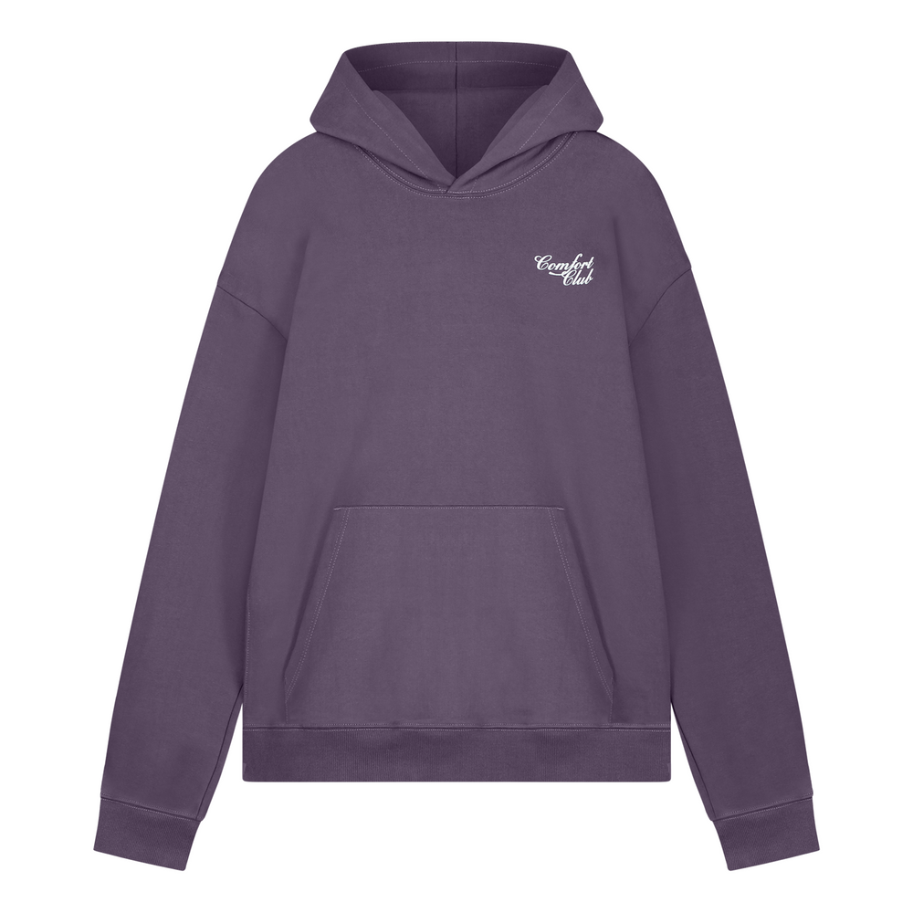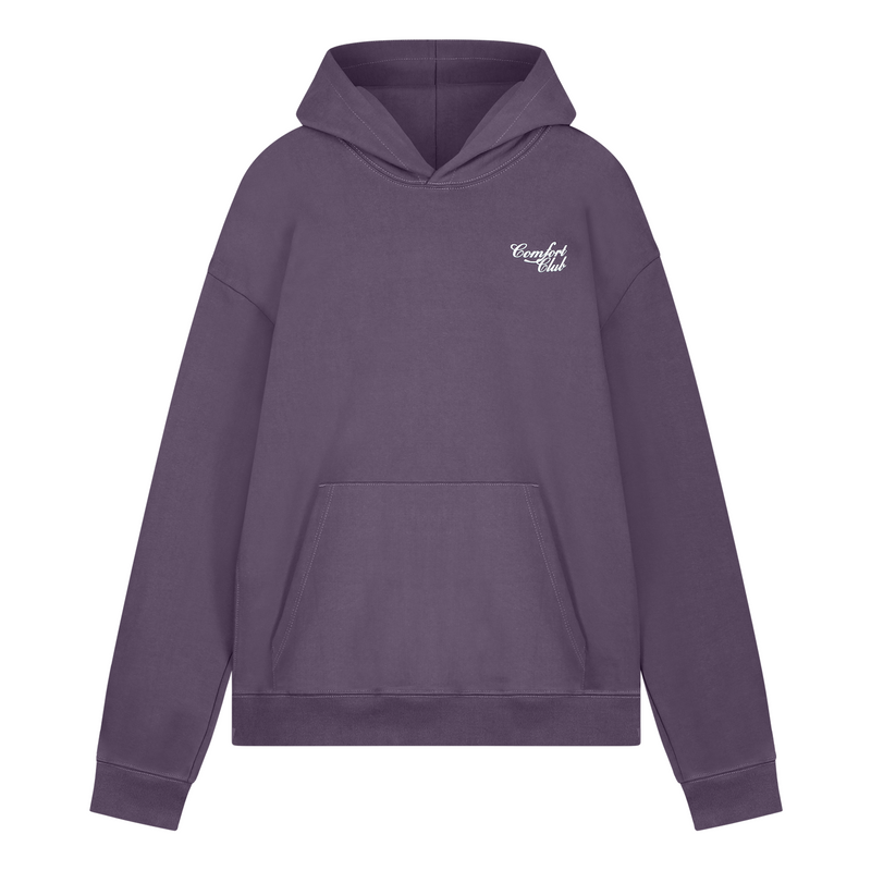 Midnight Purple hoodie with a slightly oversized fit in a heavy weight jersey cotton. Super soft, pre-shrunk and piece dyed for the ultimate jersey. Ribbed hem & cuffs. Comfort Club Chip graphic print to the chest & back.