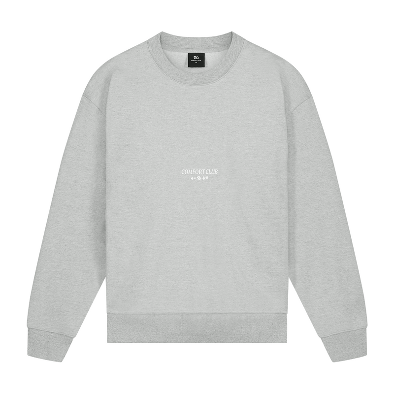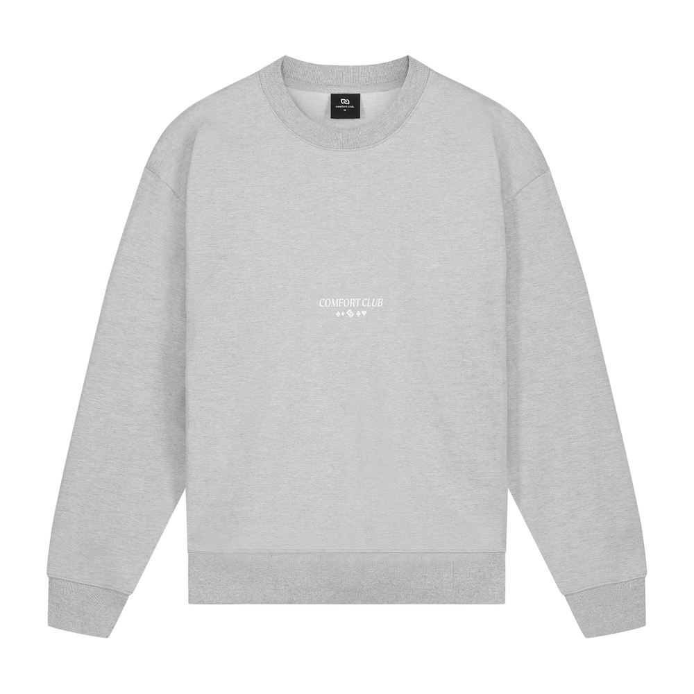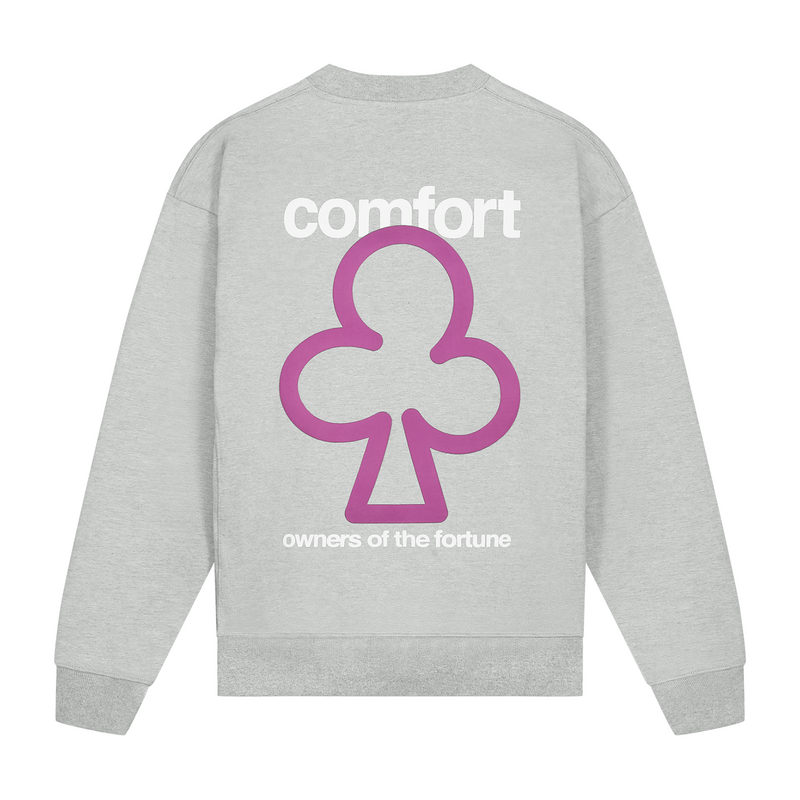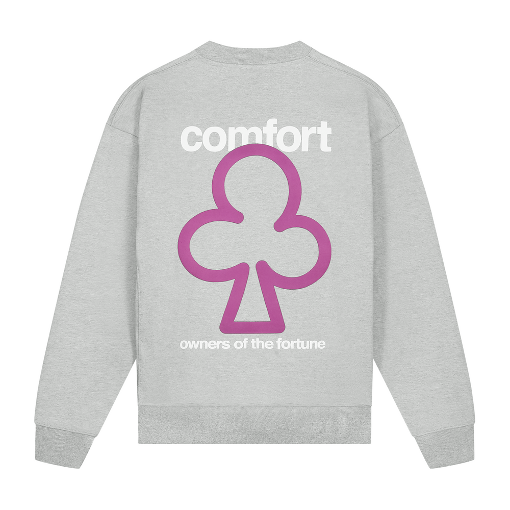 Light Gray Marl sweater with a slightly oversized fit in a heavy weight cotton. Ribbed hem & cuffs. Comfort Club Clover print to the chest & puff print back.