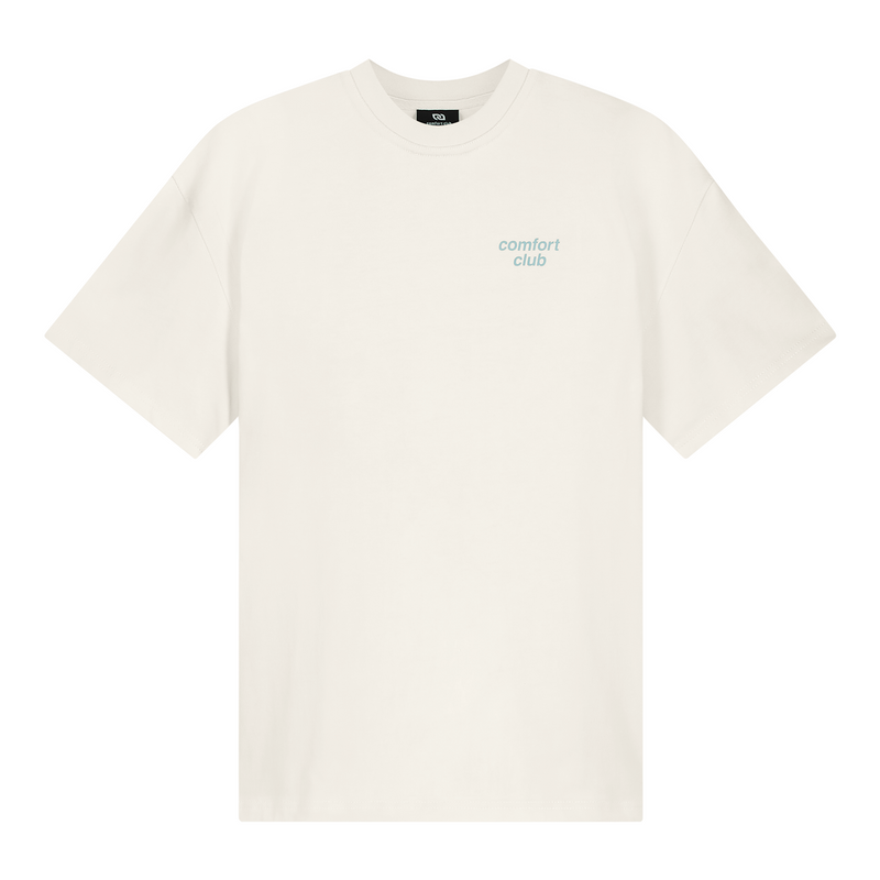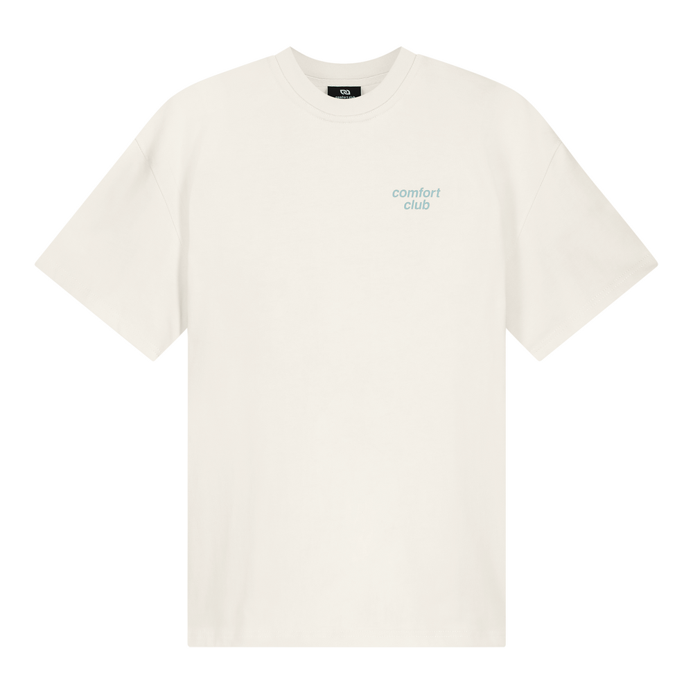 Short sleeve jersey t-shirt in off white. Slightly oversized fit in a medium weight cotton. Ribbed crewneck collar. Comfort Club Connecting print graphic to the chest and back.