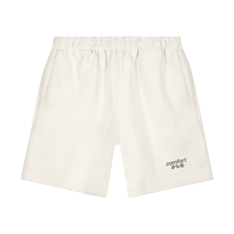 Ivory White short with a relaxed fit in a heavy weight jersey cotton. Elasticated waistband with a drawstring and zip pockets to the front. Comfort Club Daisy embroidery on the leg.