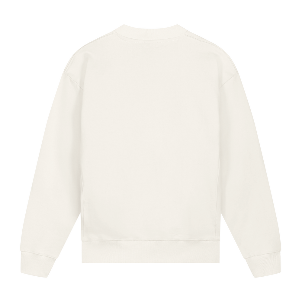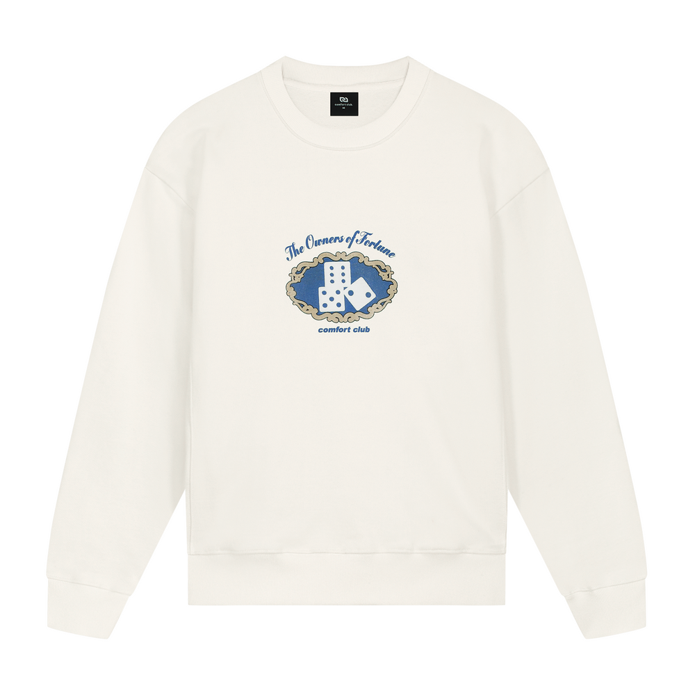 Ivory White sweater with a slightly oversized fit in a heavy weight cotton. Ribbed hem & cuffs. Comfort Club Dices puff print to the chest.
