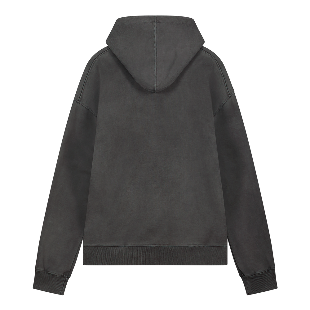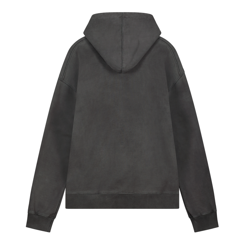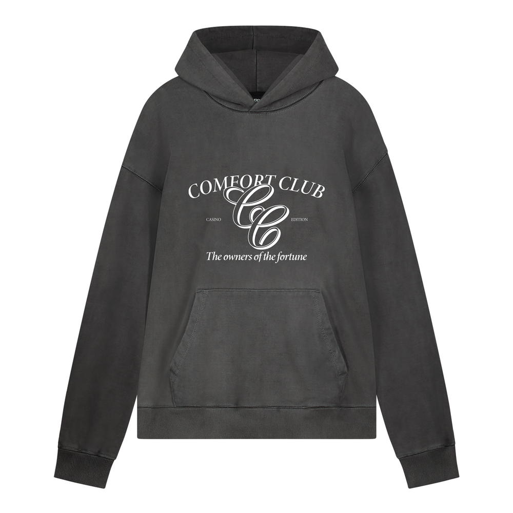 Faded Black hoodie with a slightly oversized fit in a heavy weight jersey cotton. Super soft, pre-shrunk and piece dyed for the ultimate jersey. Ribbed hem & cuffs. Comfort Club Elegance graphic print to the front.
