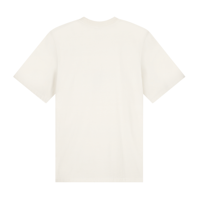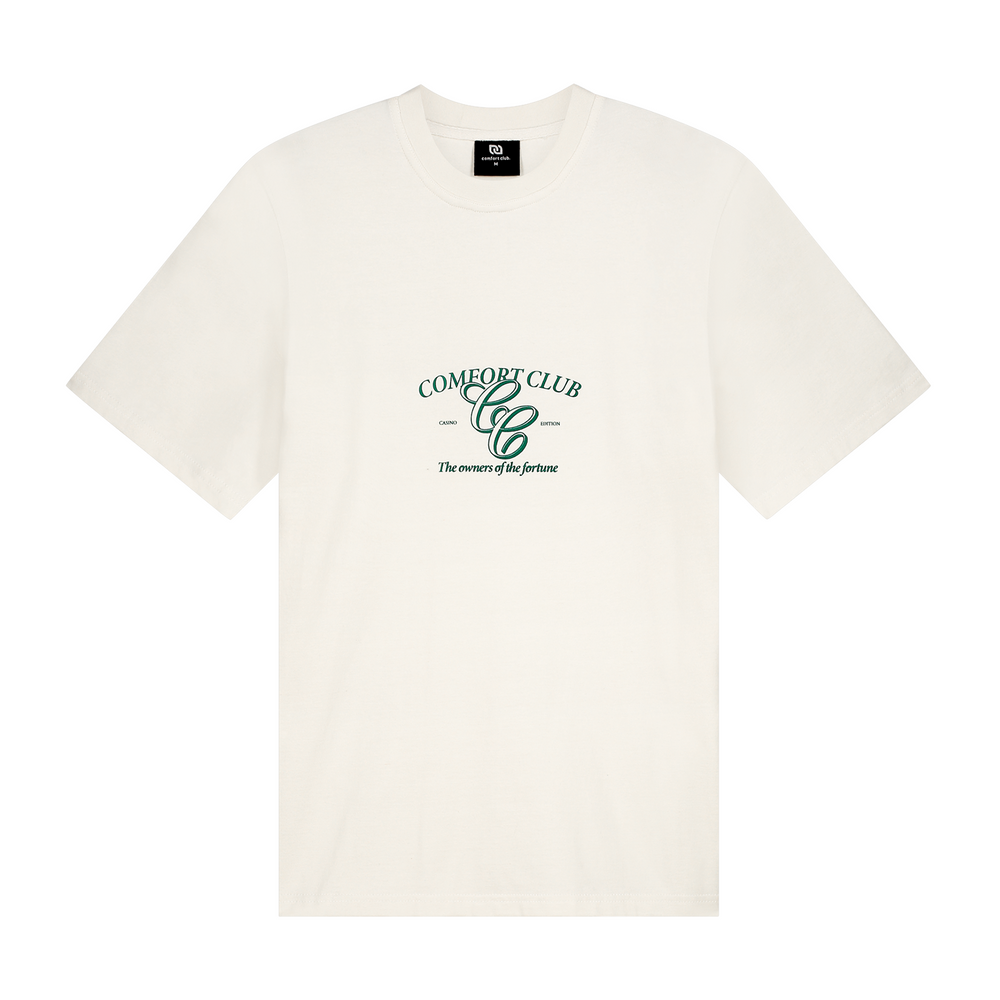 Short sleeve jersey t-shirt in off white. Slightly oversized fit in a medium weight cotton. Ribbed crewneck collar. Comfort Club Elegance print graphic to the chest.