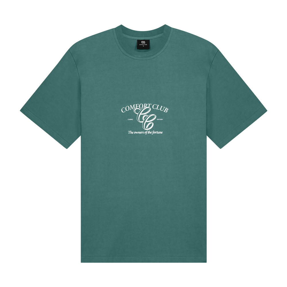 Short sleeve jersey t-shirt in teal. Slightly oversized fit in a medium weight cotton. Ribbed crewneck collar. Comfort Club Elegance print graphic to the chest.