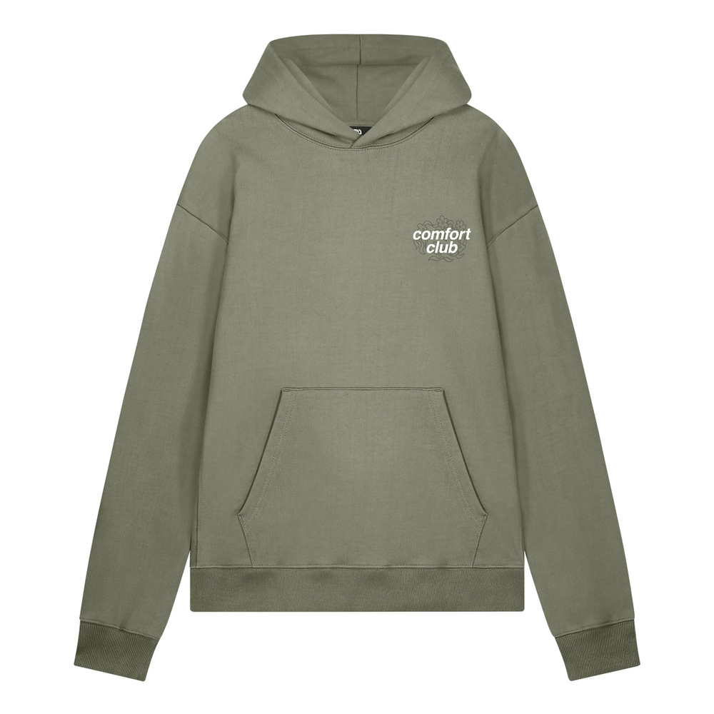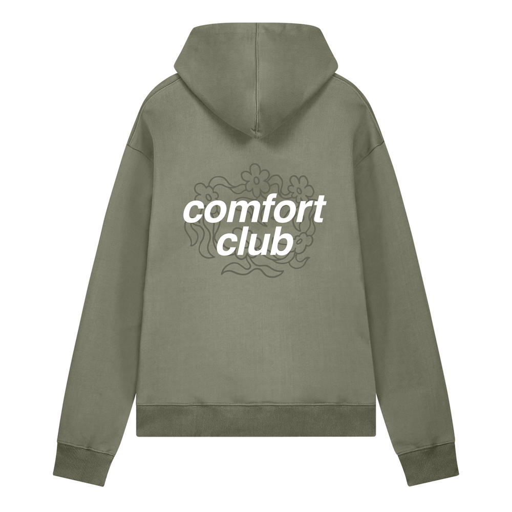Olive hoodie with a slightly oversized fit in a heavy weight jersey cotton. Super soft, pre-shrunk and piece dyed for the ultimate jersey. Ribbed hem & cuffs. Comfort Club Floral graphic print to the chest & puff print to the back.