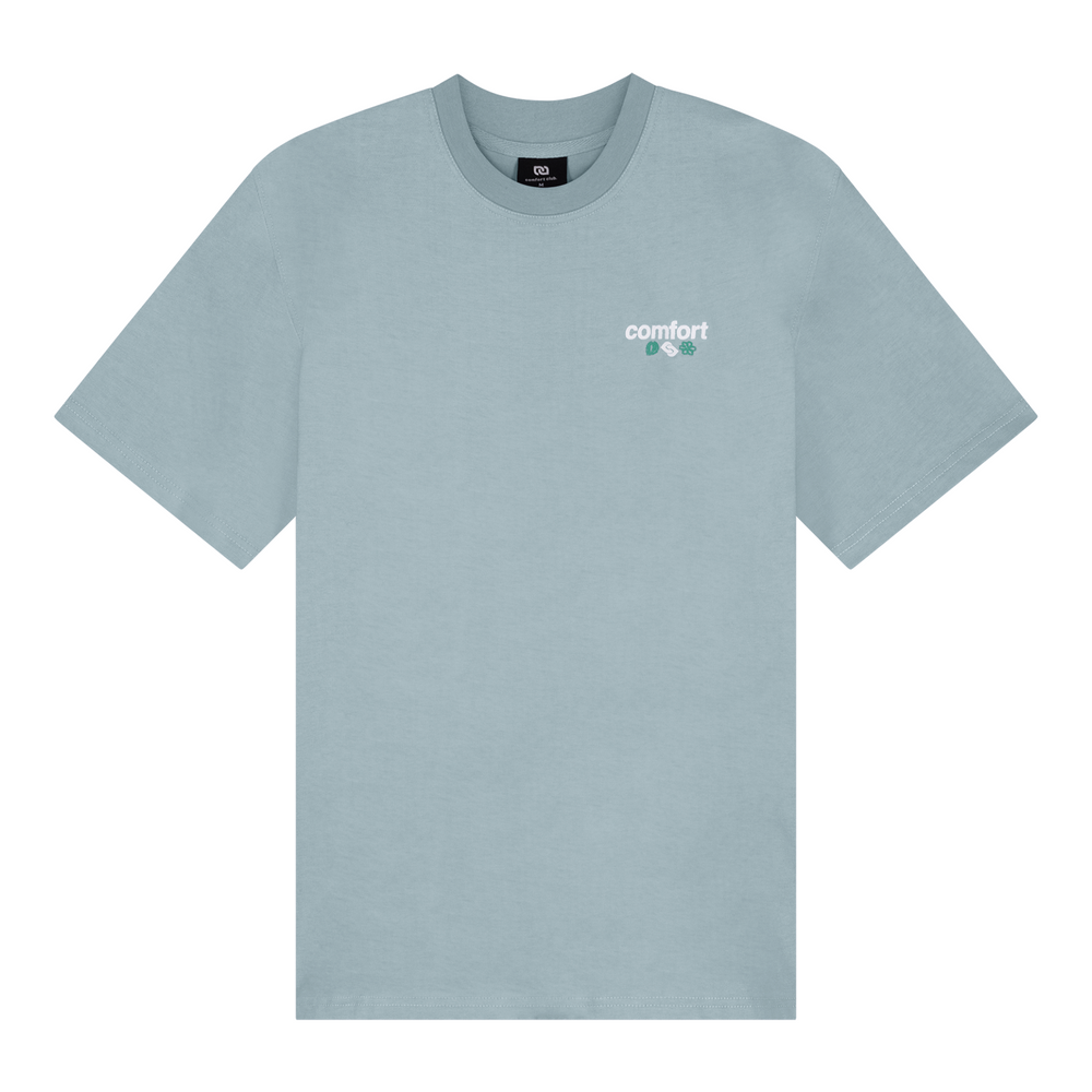 Short sleeve jersey t-shirt in azure blue. Slightly oversized fit in a medium weight cotton. Ribbed crewneck collar. Comfort Club Floret print graphic to the chest and back.
