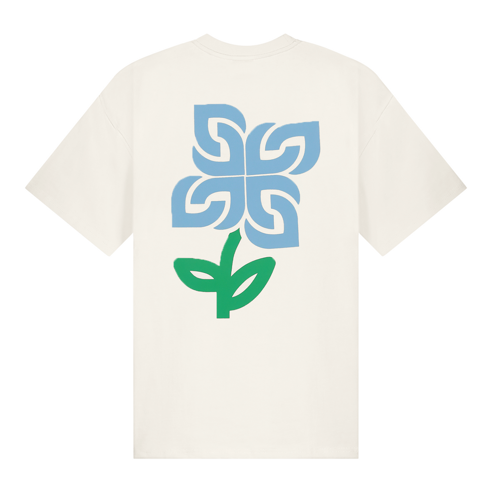 Short sleeve jersey t-shirt in off white. Slightly oversized fit in a medium weight cotton. Ribbed crewneck collar. Comfort Club Floret print graphic to the chest and back.