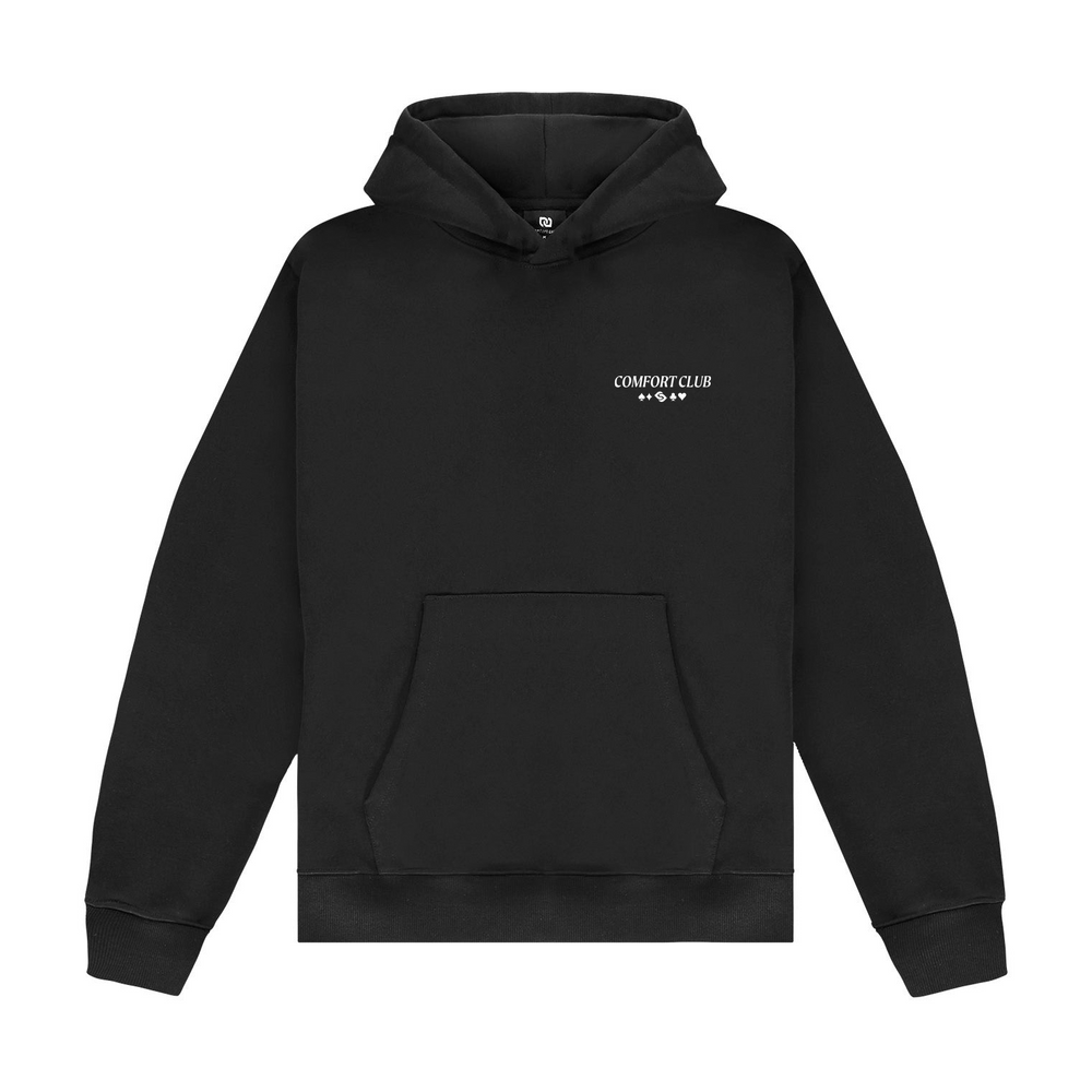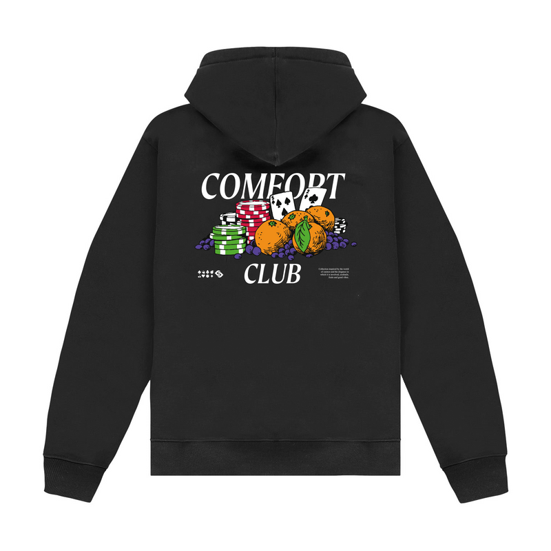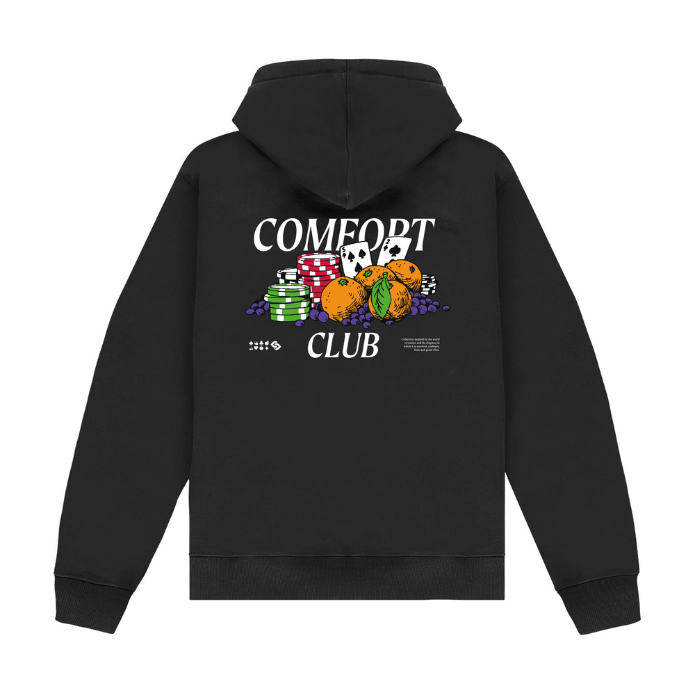 Black hoodie with a slightly oversized fit in a heavy weight jersey cotton. Super soft, pre-shrunk and piece dyed for the ultimate jersey. Ribbed hem & cuffs. Comfort Club Fruit Fortune graphic print to the chest & back.
