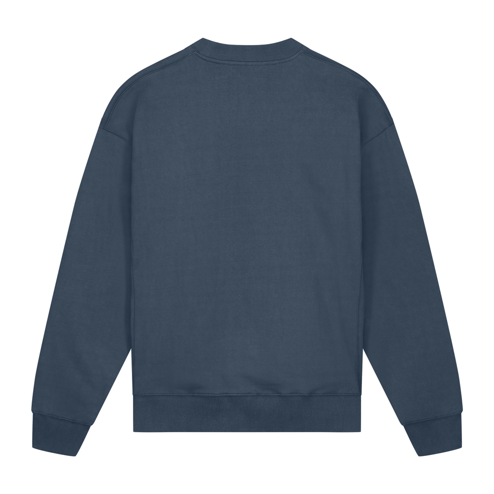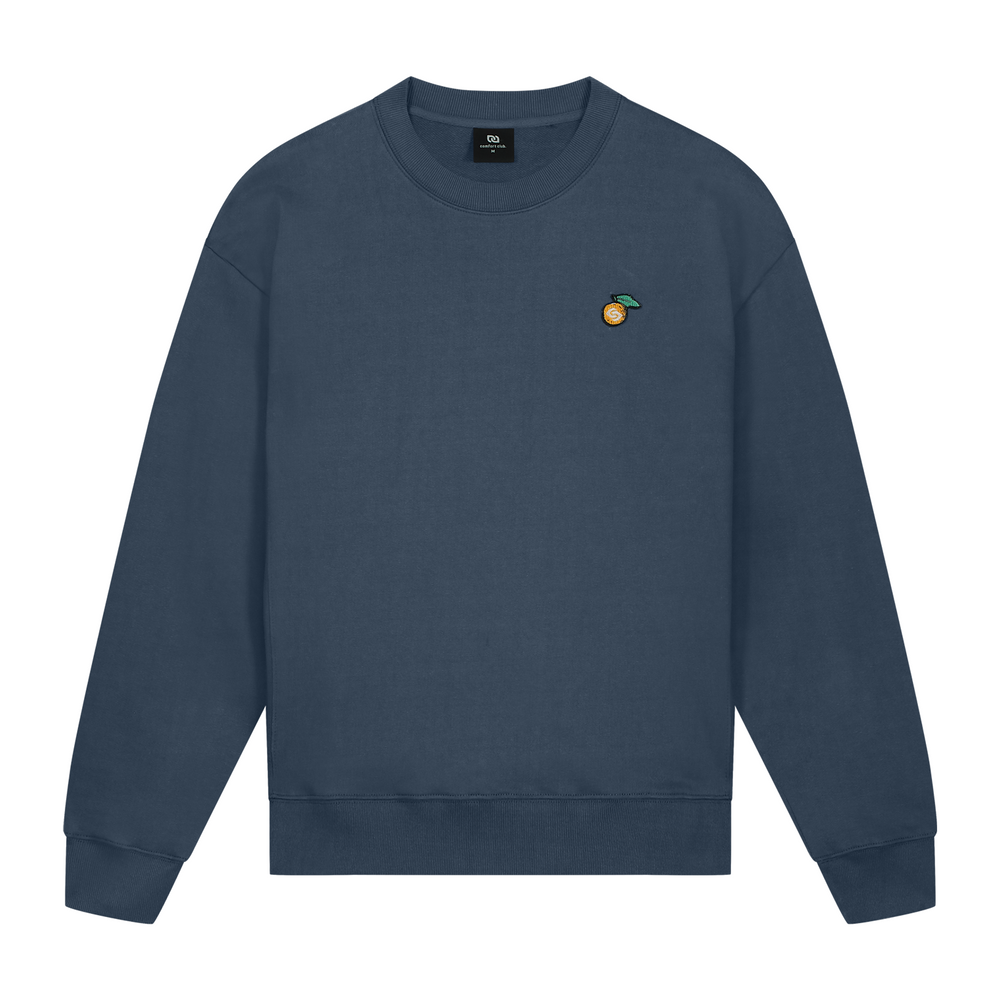 Navy sweater with a slightly oversized fit in a heavy weight cotton. Ribbed hem & cuffs. Comfort Club Grape patch to the chest.