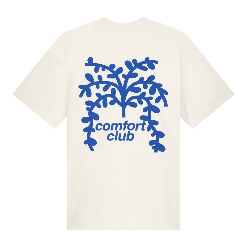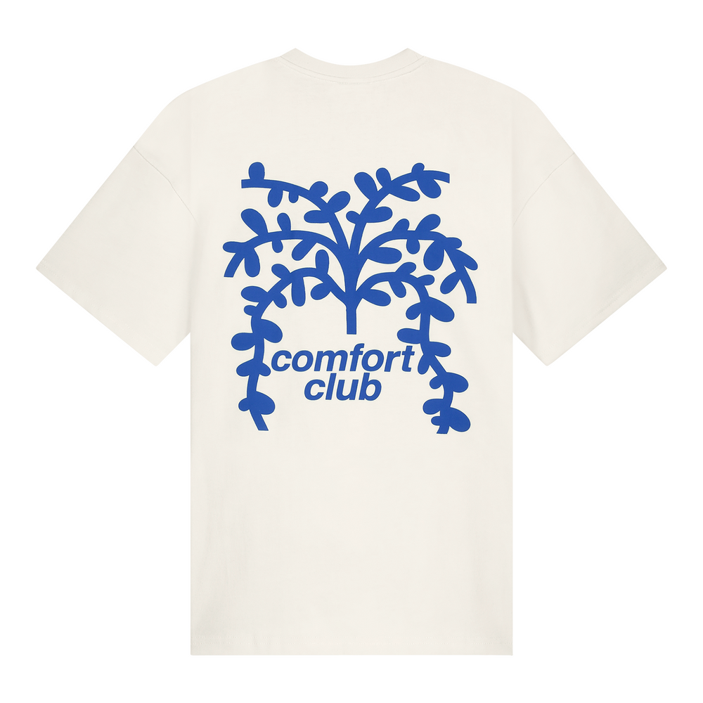 Short sleeve jersey t-shirt in off white. Slightly oversized fit in a medium weight cotton. Ribbed crewneck collar. Comfort Club Hedera print graphic to the chest and back.