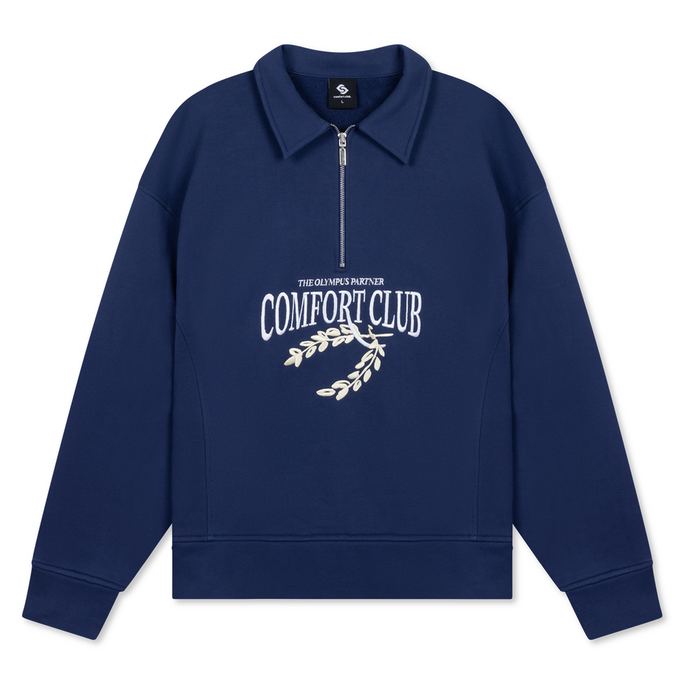 Medieval blue half zip with a slightly oversized fit in a heavy weight cotton. Ribbed hem & cuffs. Comfort Club Laurel embroidery to the chest.