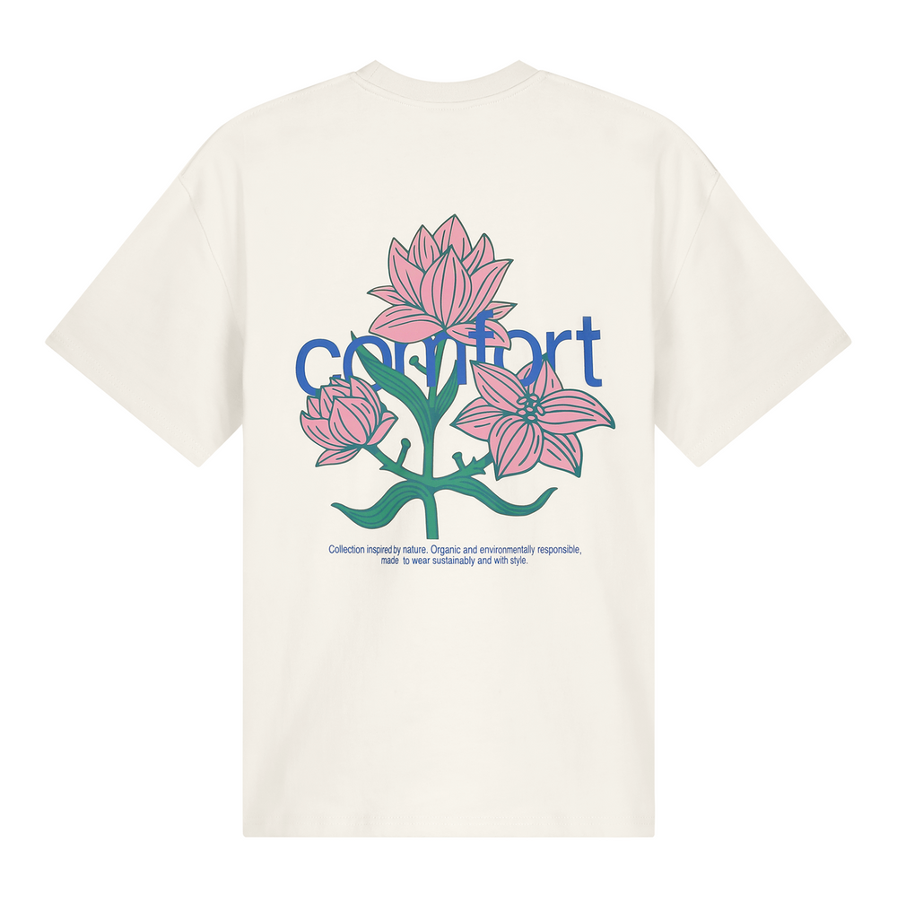 Short sleeve jersey t-shirt in off white. Slightly oversized fit in a medium weight cotton. Ribbed crewneck collar. Comfort Club Lilium print graphic to the chest and back.