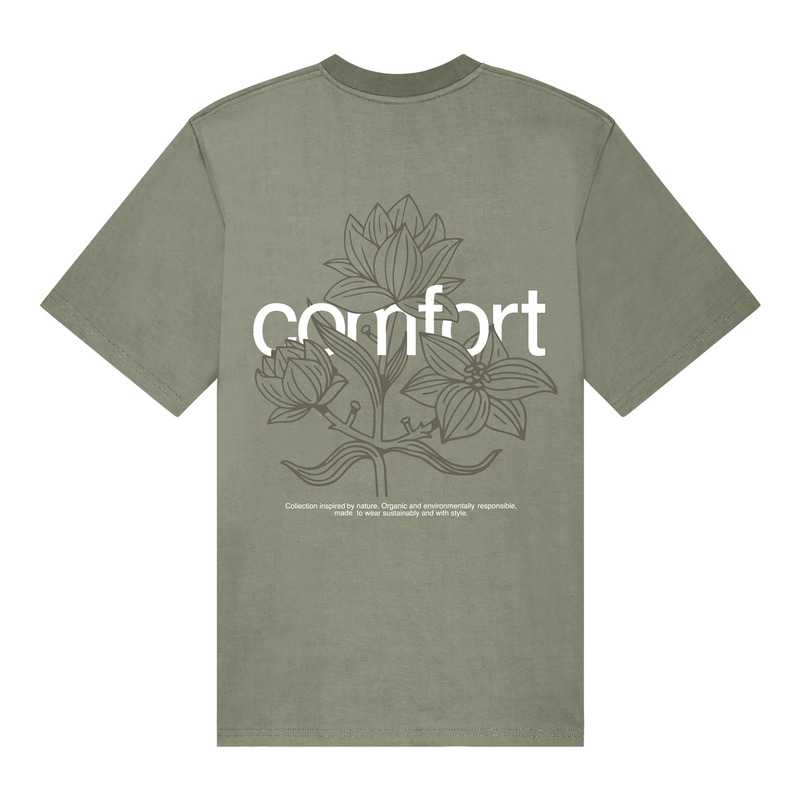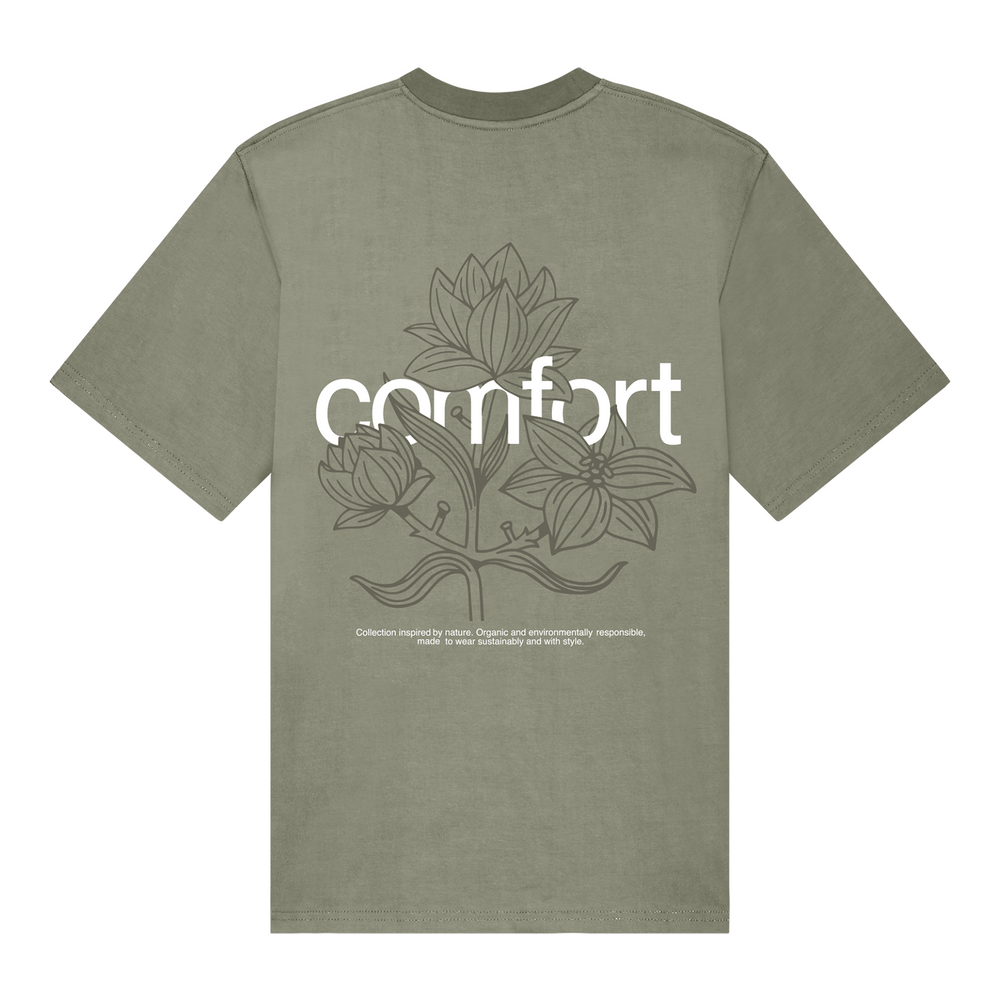 Short sleeve jersey t-shirt in olive. Slightly oversized fit in a medium weight cotton. Ribbed crewneck collar. Comfort Club Lilium print graphic to the chest and back.