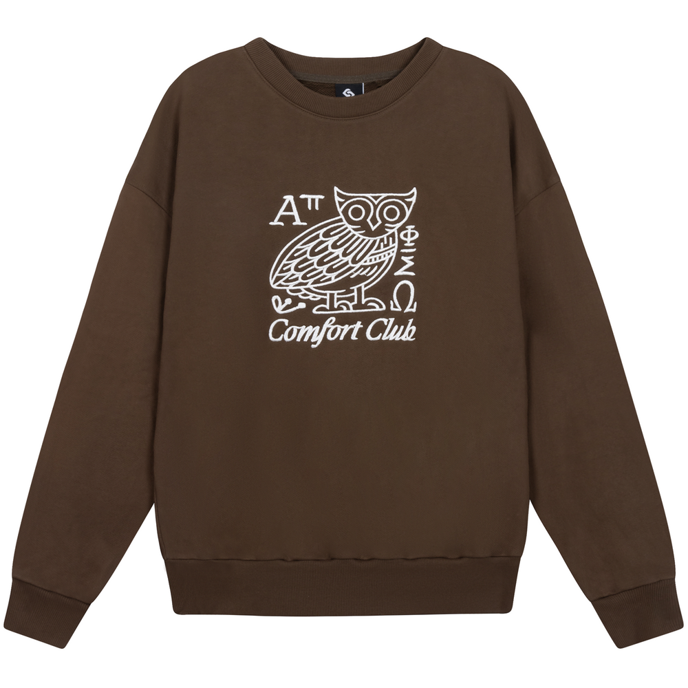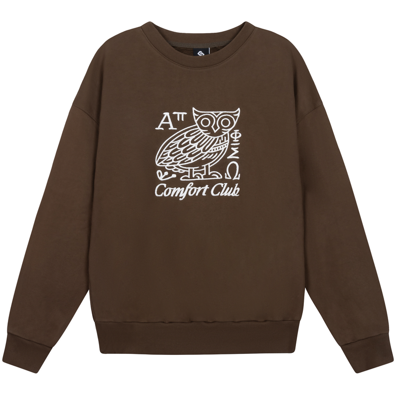Minerva sweater with a slightly oversized fit in a heavy weight cotton. Ribbed hem & cuffs. Comfort Club Minerva embroidery to the chest.