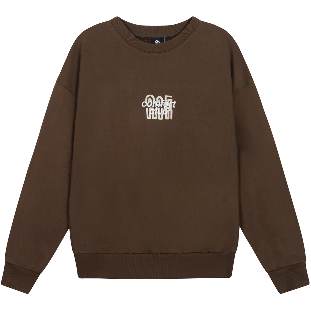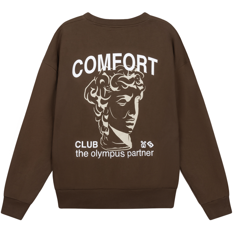 Olympus sweater with a slightly oversized fit in a heavy weight cotton. Ribbed hem & cuffs. Comfort Club Olympus print to the chest & back.