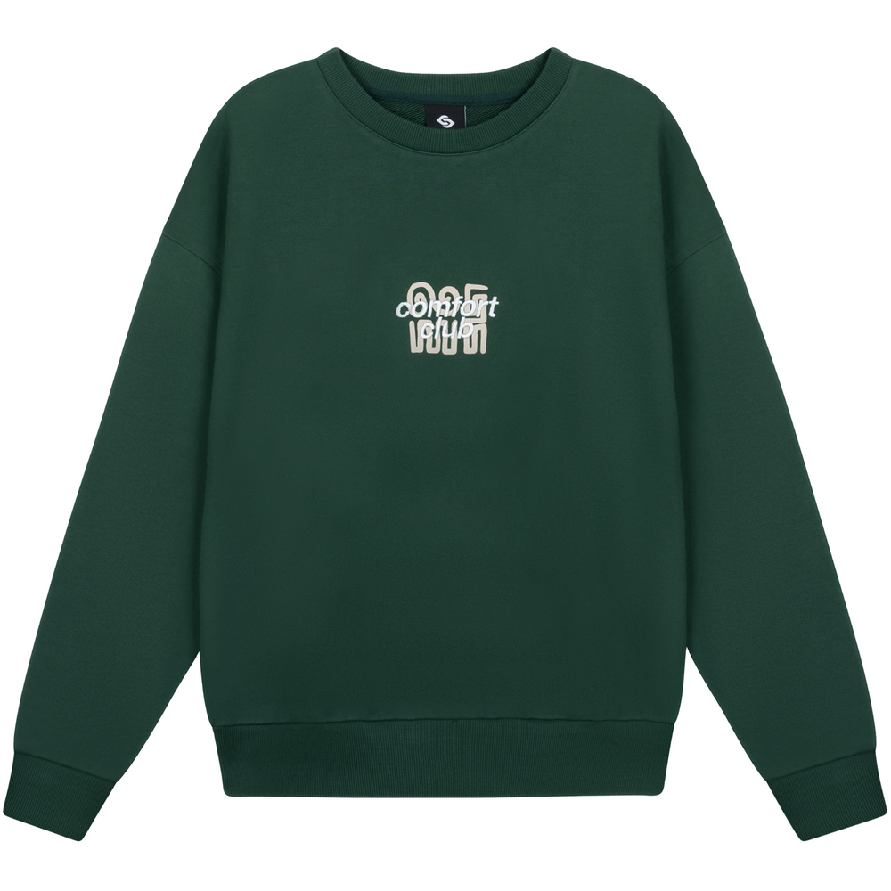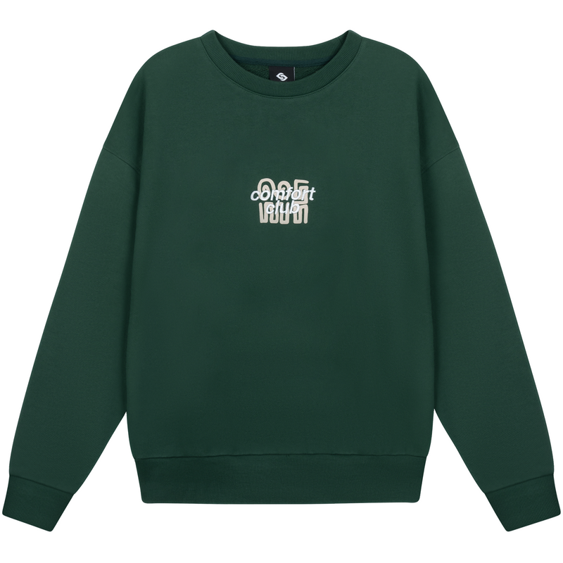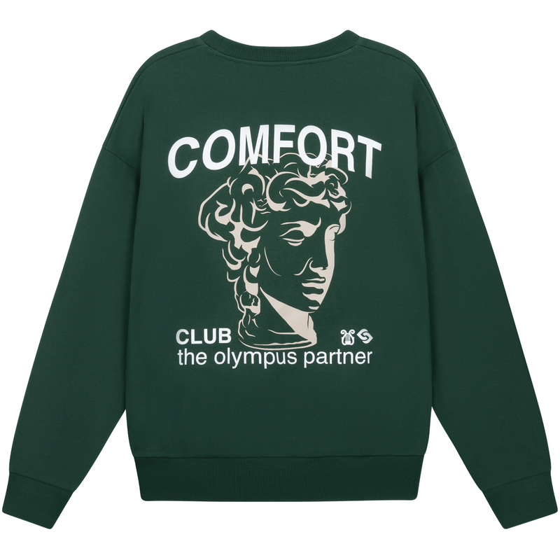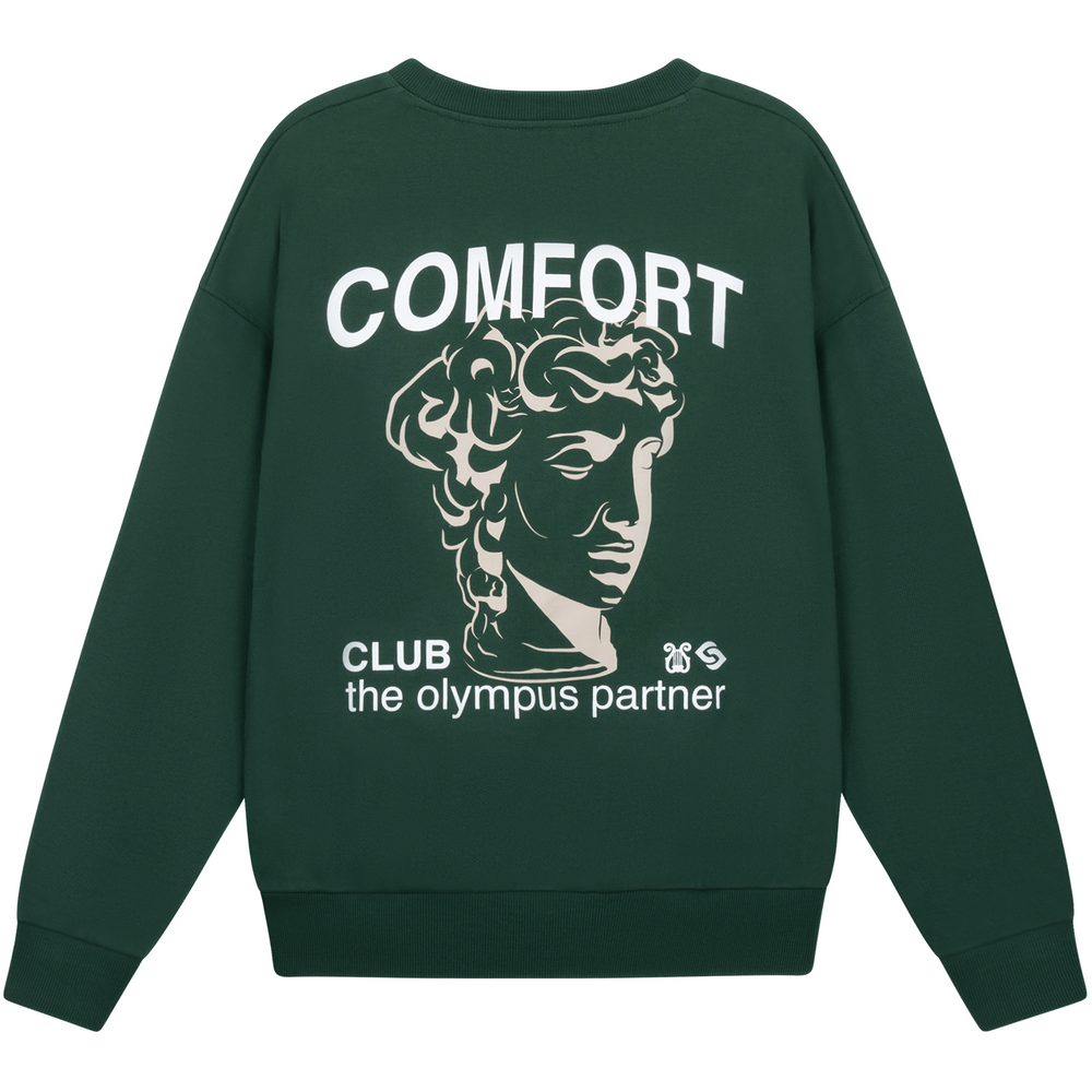Olympus sweater with a slightly oversized fit in a heavy weight cotton. Ribbed hem & cuffs. Comfort Club Olympus print to the chest & back.