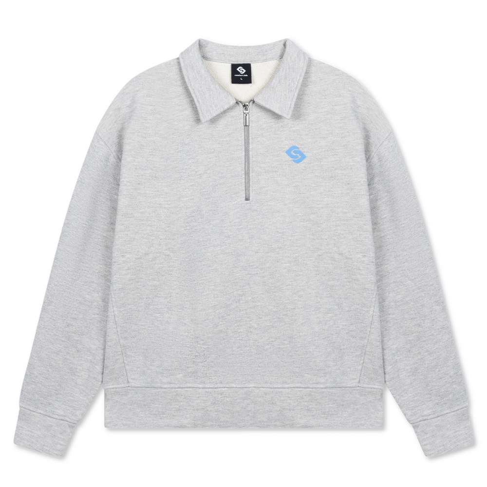 Light Gray Marl half zip with a slightly oversized fit in a heavy weight cotton. Ribbed hem & cuffs. Comfort Club Olympus print to the chest & back.