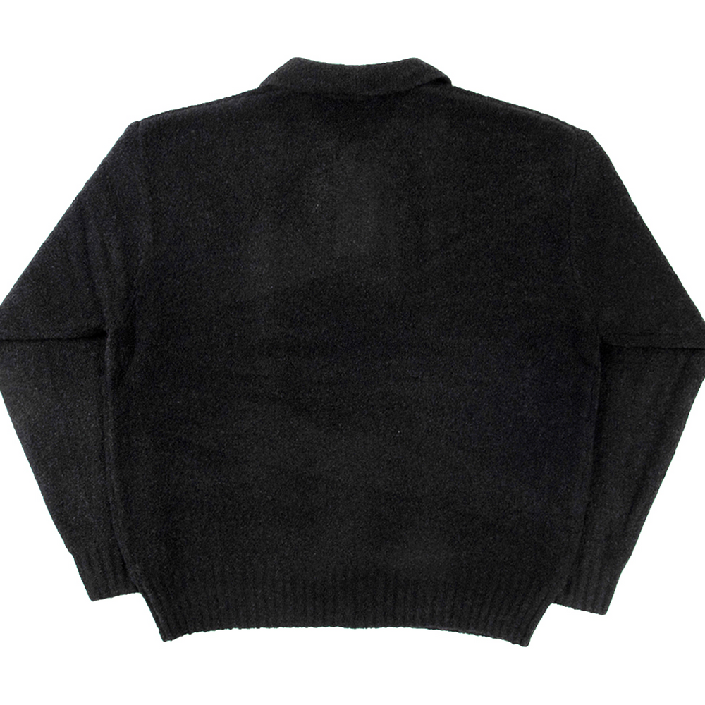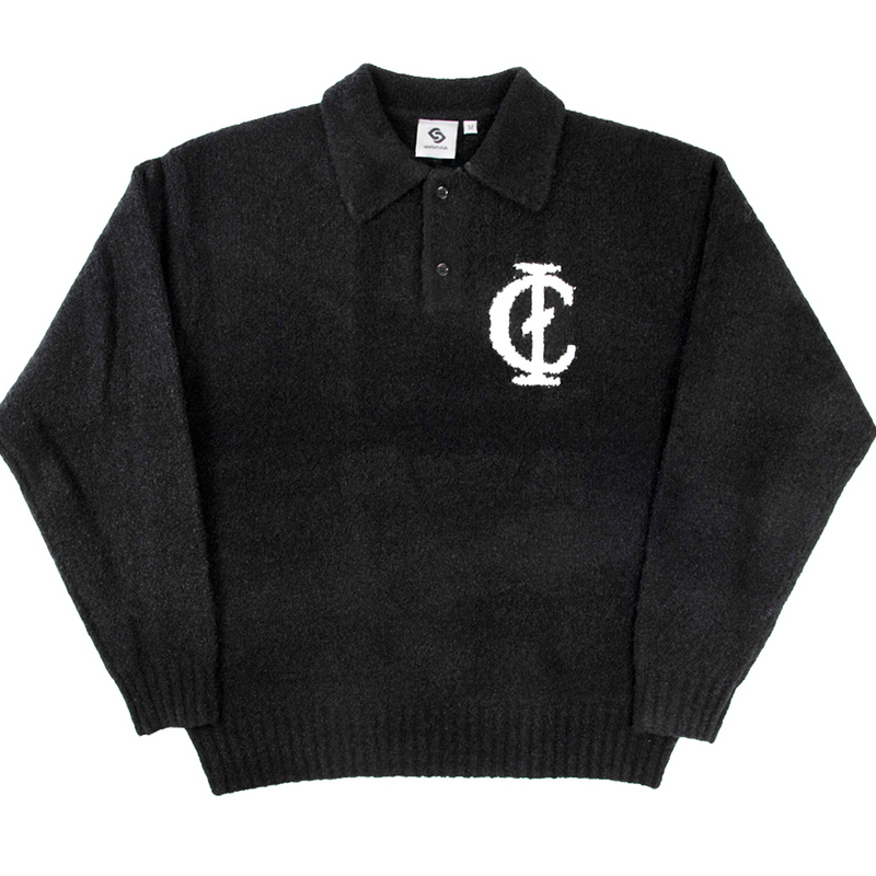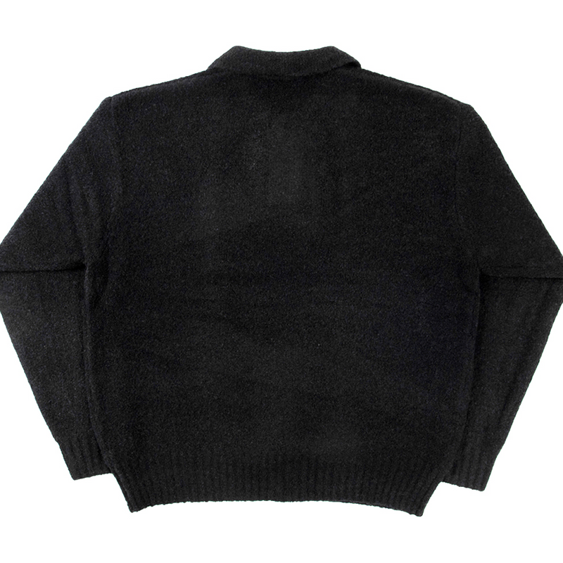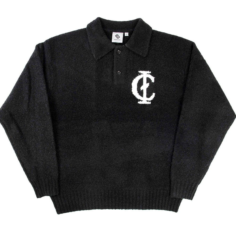 Black knit polo, a luxury knitwear piece with long sleeves and a polo neckline and collar.. The Gamma Knit Polo features our gamma logo to the chest; it has ribbed cuffs and hems.
