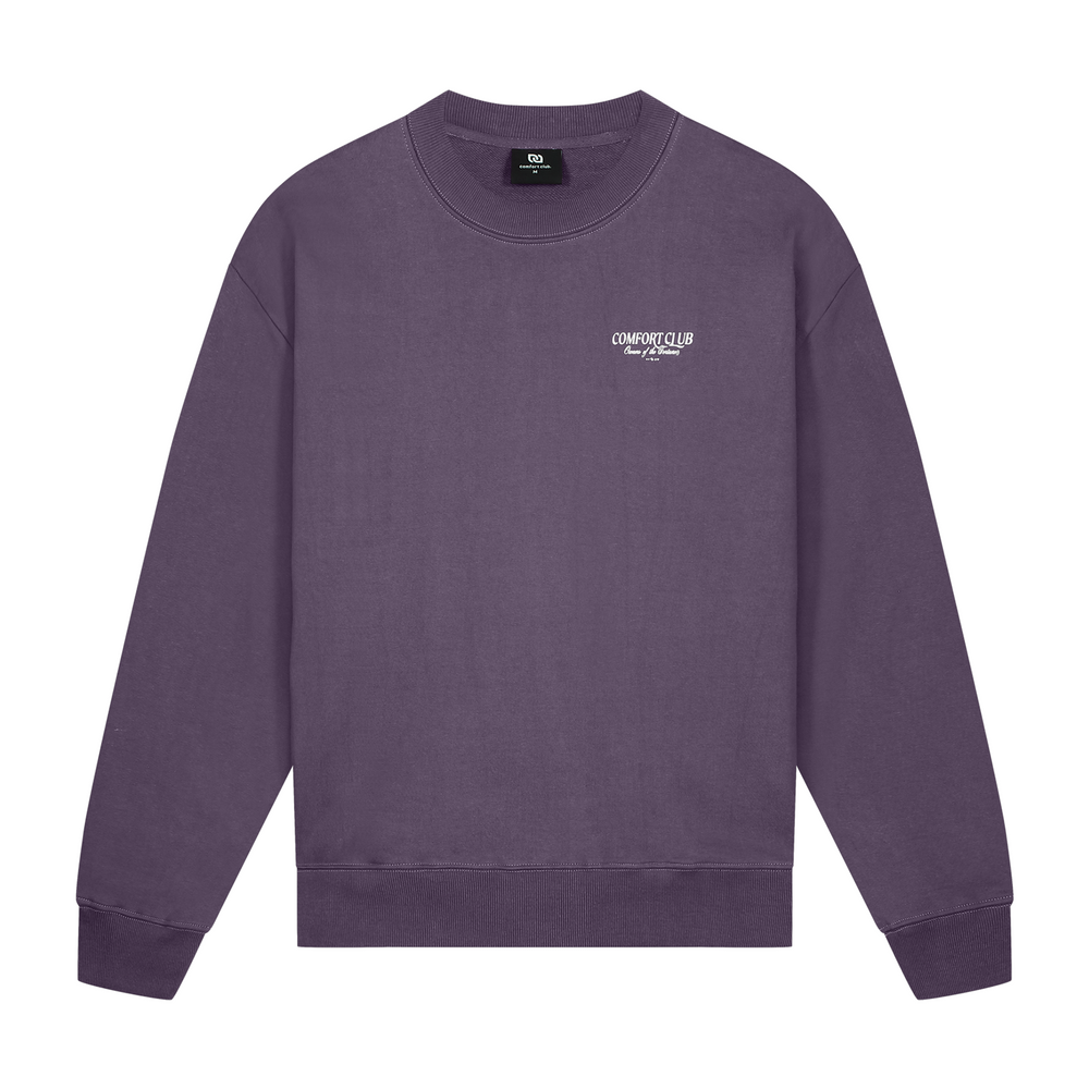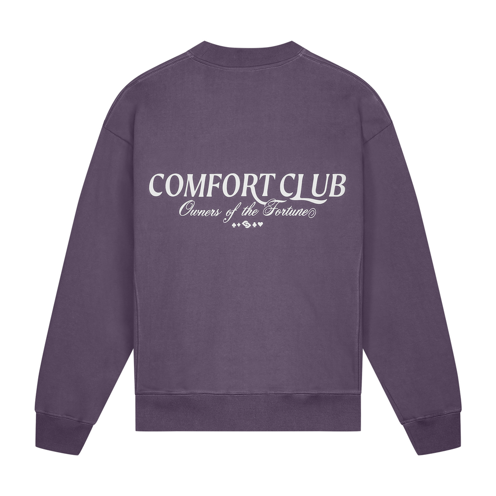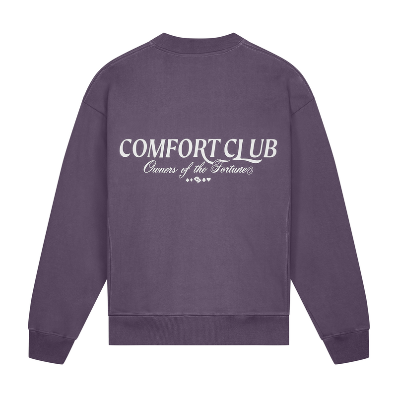 Midnight Purple sweater with a slightly oversized fit in a heavy weight cotton. Ribbed hem & cuffs. Comfort Club Owners of Fortune print to the chest & back.