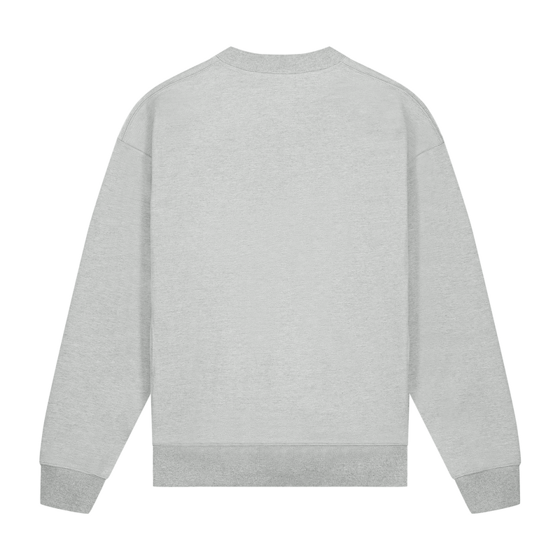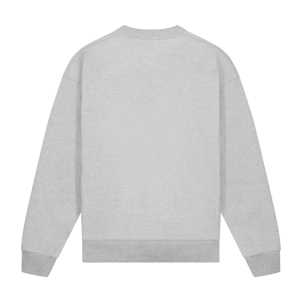 Light Gray Marl sweater with a slightly oversized fit in a heavy weight cotton. Ribbed hem & cuffs. Comfort Club Owners of Fortune print to the chest & back.