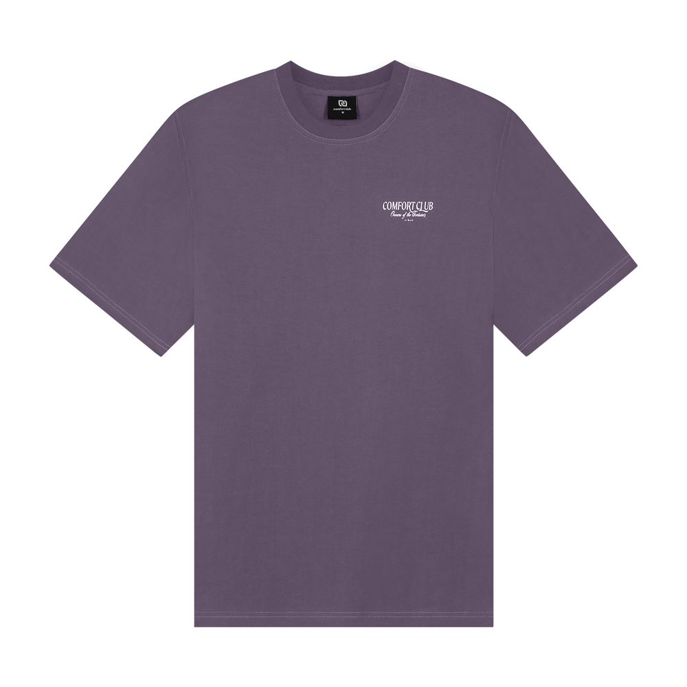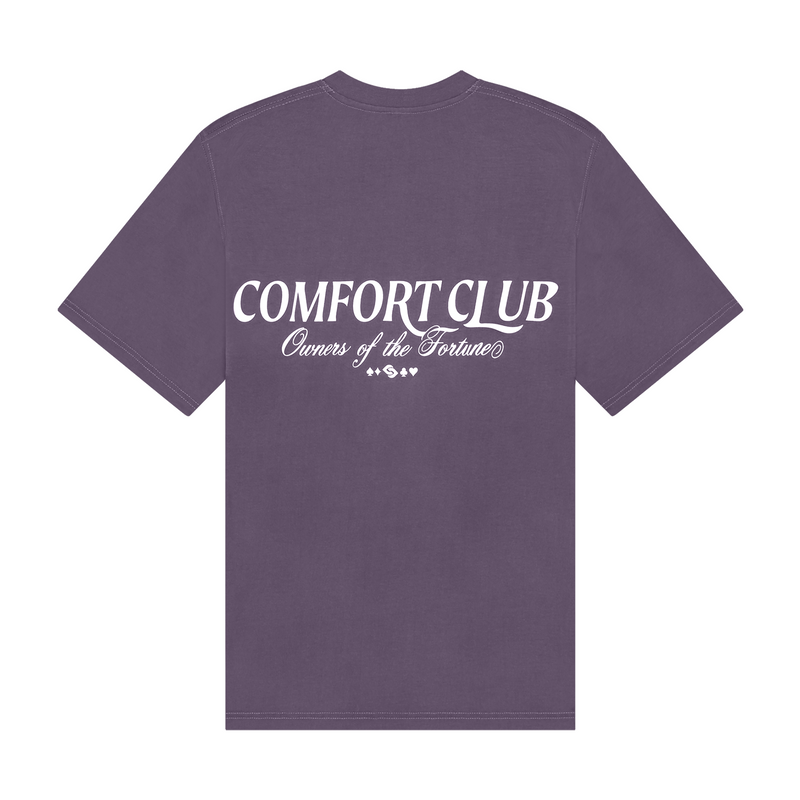 Short sleeve jersey t-shirt in Midnight Purple. Slightly oversized fit in a medium weight cotton. Ribbed crewneck collar. Comfort Club Owners of Fortune Graphic print branding to the chest & back.