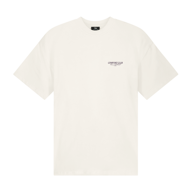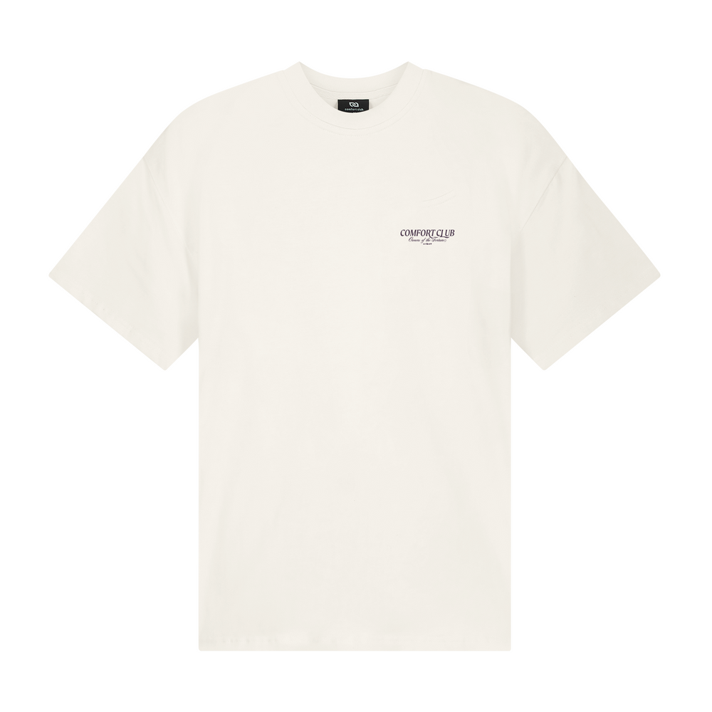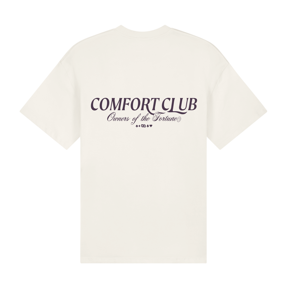 Short sleeve jersey t-shirt in Off White. Slightly oversized fit in a medium weight cotton. Ribbed crewneck collar. Comfort Club Owners of Fortune Graphic print branding to the chest & back.