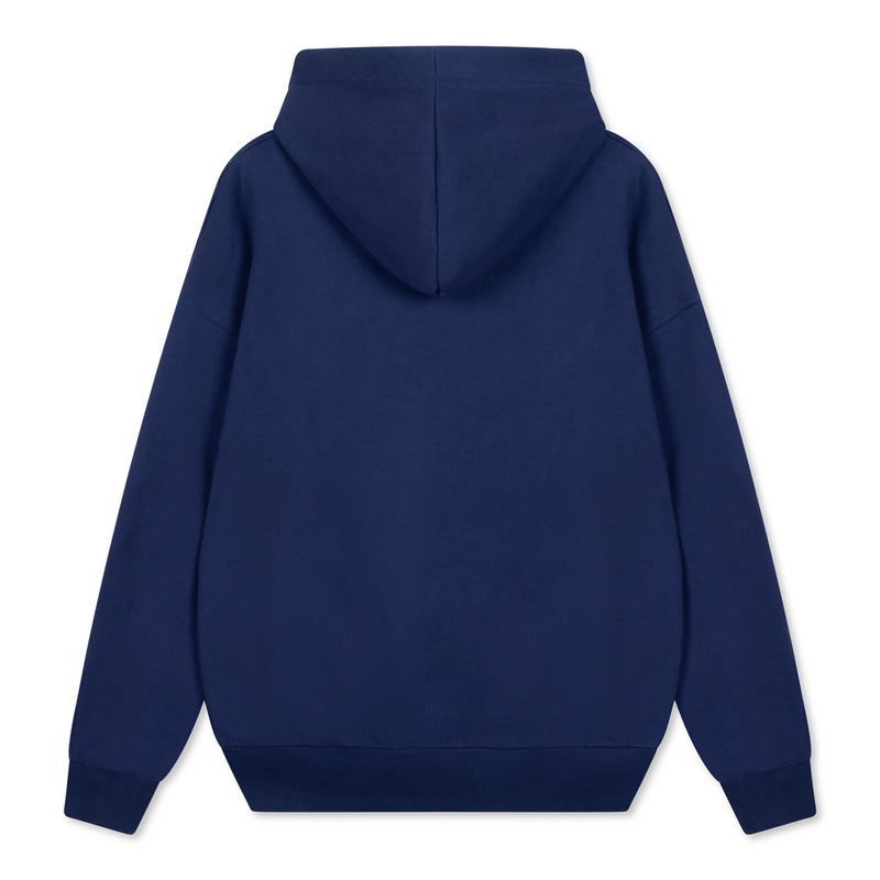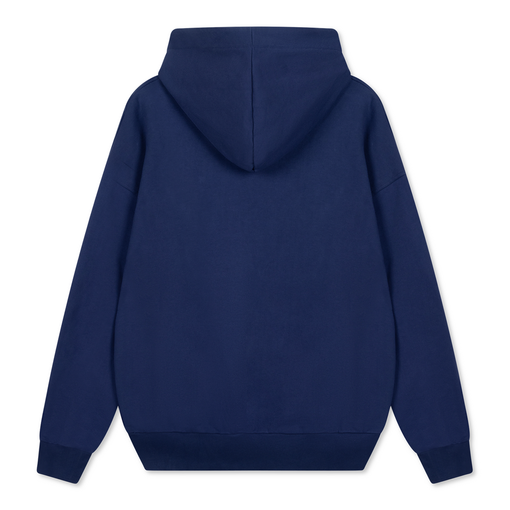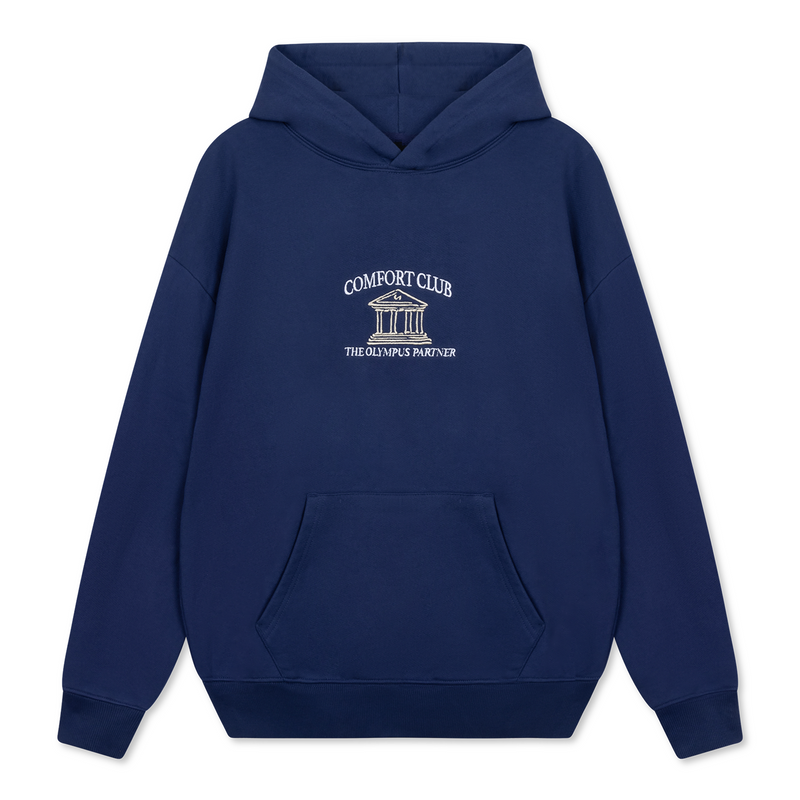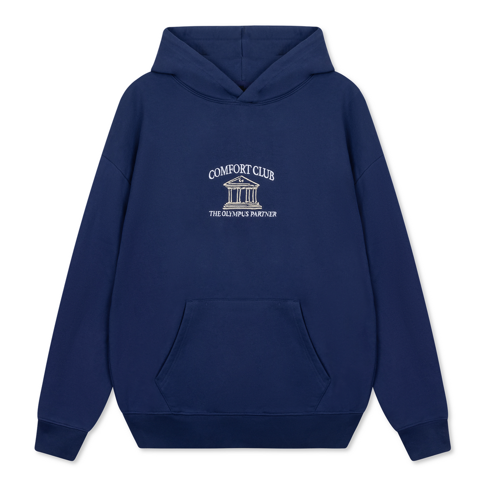 Medieval Blue hoodie with a slightly oversized fit in a heavy weight jersey cotton. Super soft, pre-shrunk and piece dyed for the ultimate jersey. Ribbed hem & cuffs. Comfort Club Chip Parthenon embroidery to the chest.