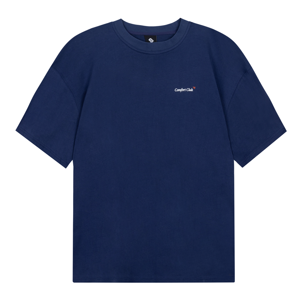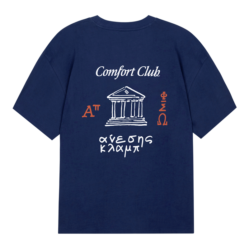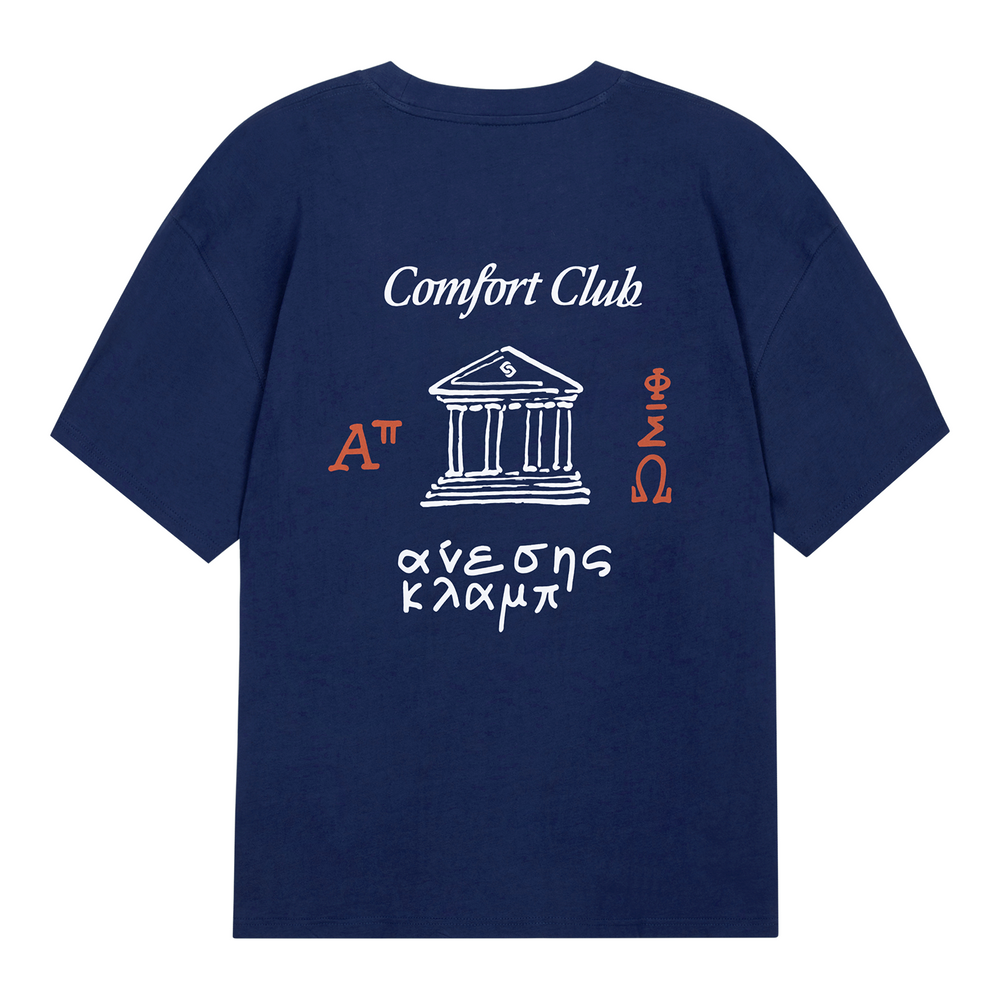 Short sleeve jersey t-shirt in Medieval Blue (Navy). Slightly oversized fit in a medium weight cotton. Ribbed crewneck collar. Comfort Club Parthenon print graphic to the chest and back.
