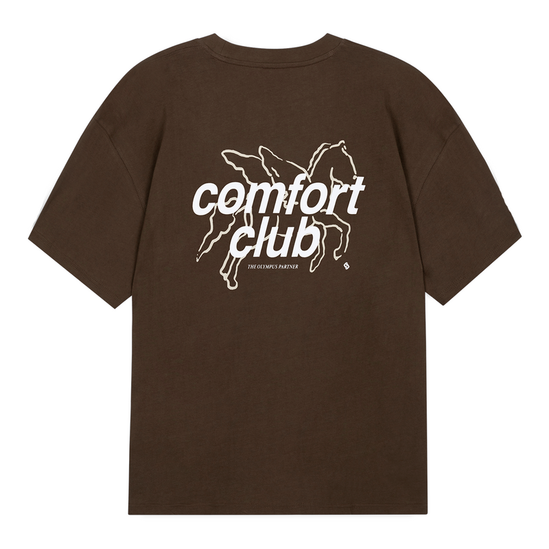 Short sleeve jersey t-shirt in carafe (brown). Slightly oversized fit in a medium weight cotton. Ribbed crewneck collar. Comfort Club Pegasus print graphic to the chest and back.
