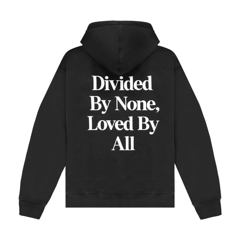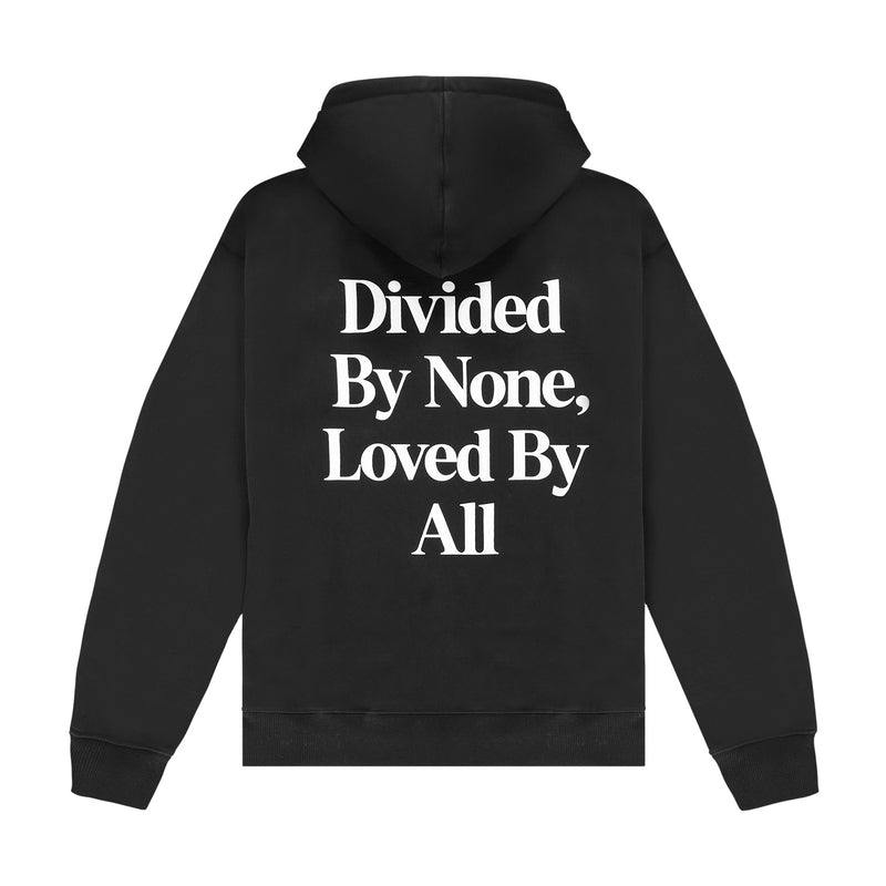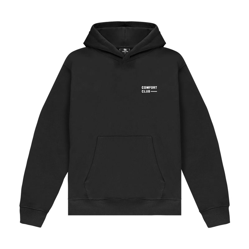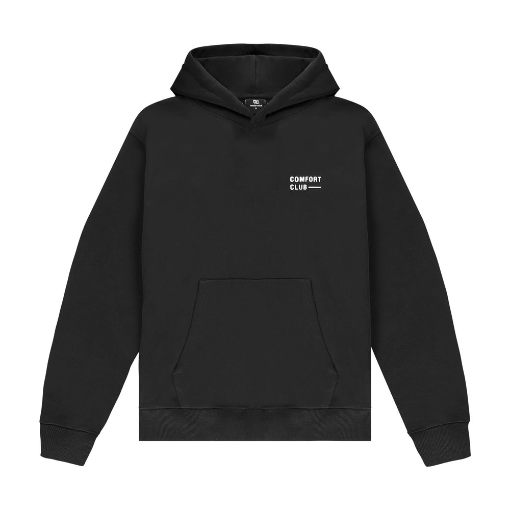 Black hoodie with a slightly oversized fit in a heavy weight jersey cotton. Super soft, pre-shrunk and piece dyed for the ultimate jersey. Ribbed hem & cuffs. Comfort Club Quote graphic print to the chest & back.