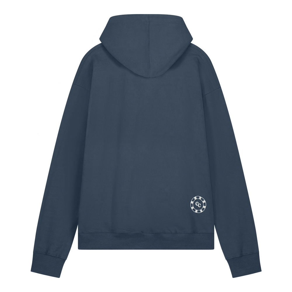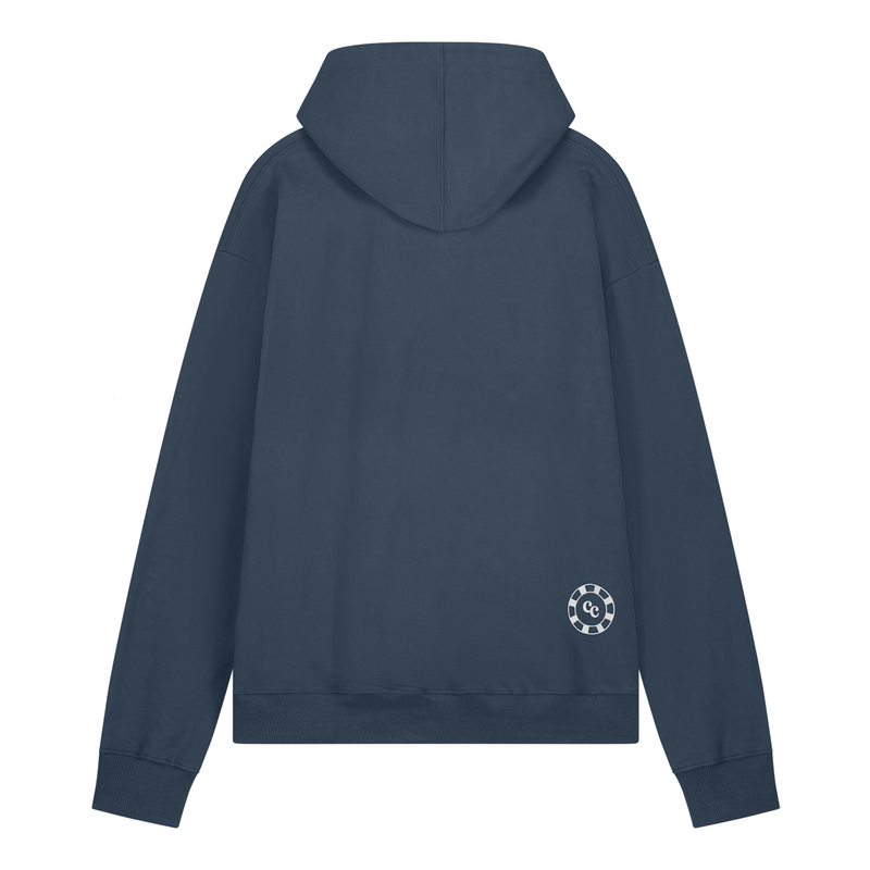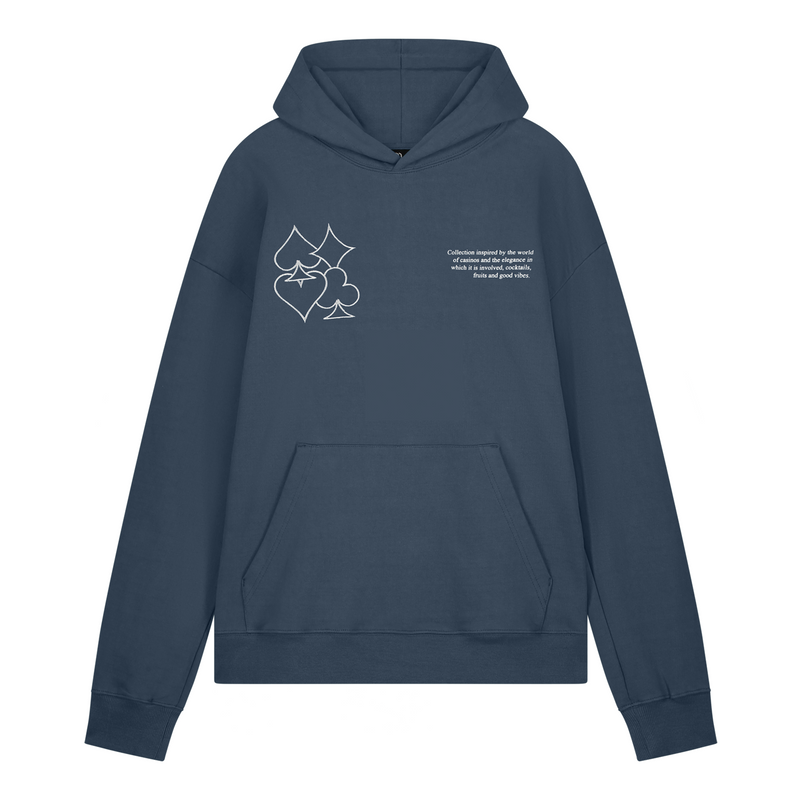 Navy hoodie with a slightly oversized fit in a heavy weight jersey cotton. Super soft, pre-shrunk and piece dyed for the ultimate jersey. Ribbed hem & cuffs. Comfort Club Royal Aces graphic print to the chest & back.