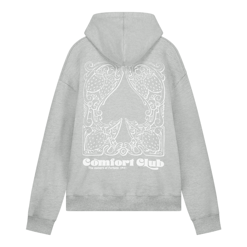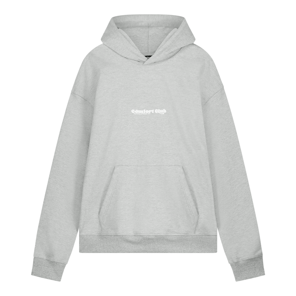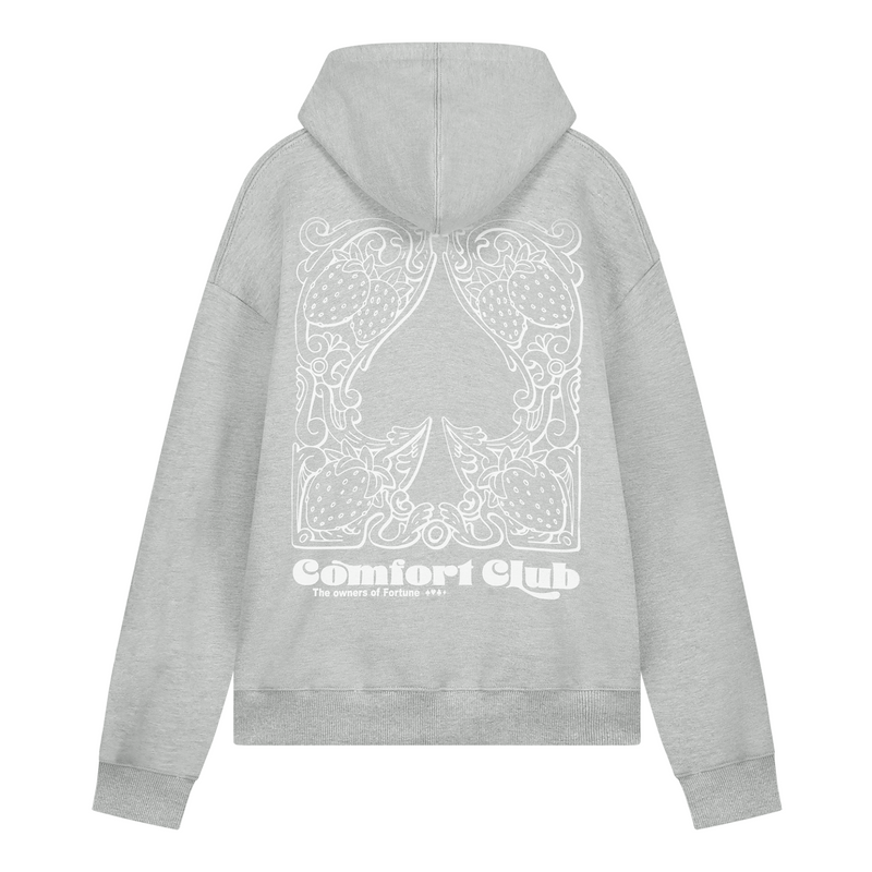 Light Gray Marl hoodie with a slightly oversized fit in a heavy weight jersey cotton. Super soft, pre-shrunk and piece dyed for the ultimate jersey. Ribbed hem & cuffs. Comfort Club Spadille graphic print to the chest & back.