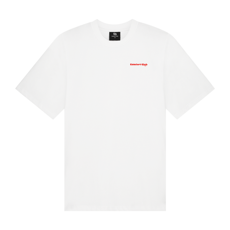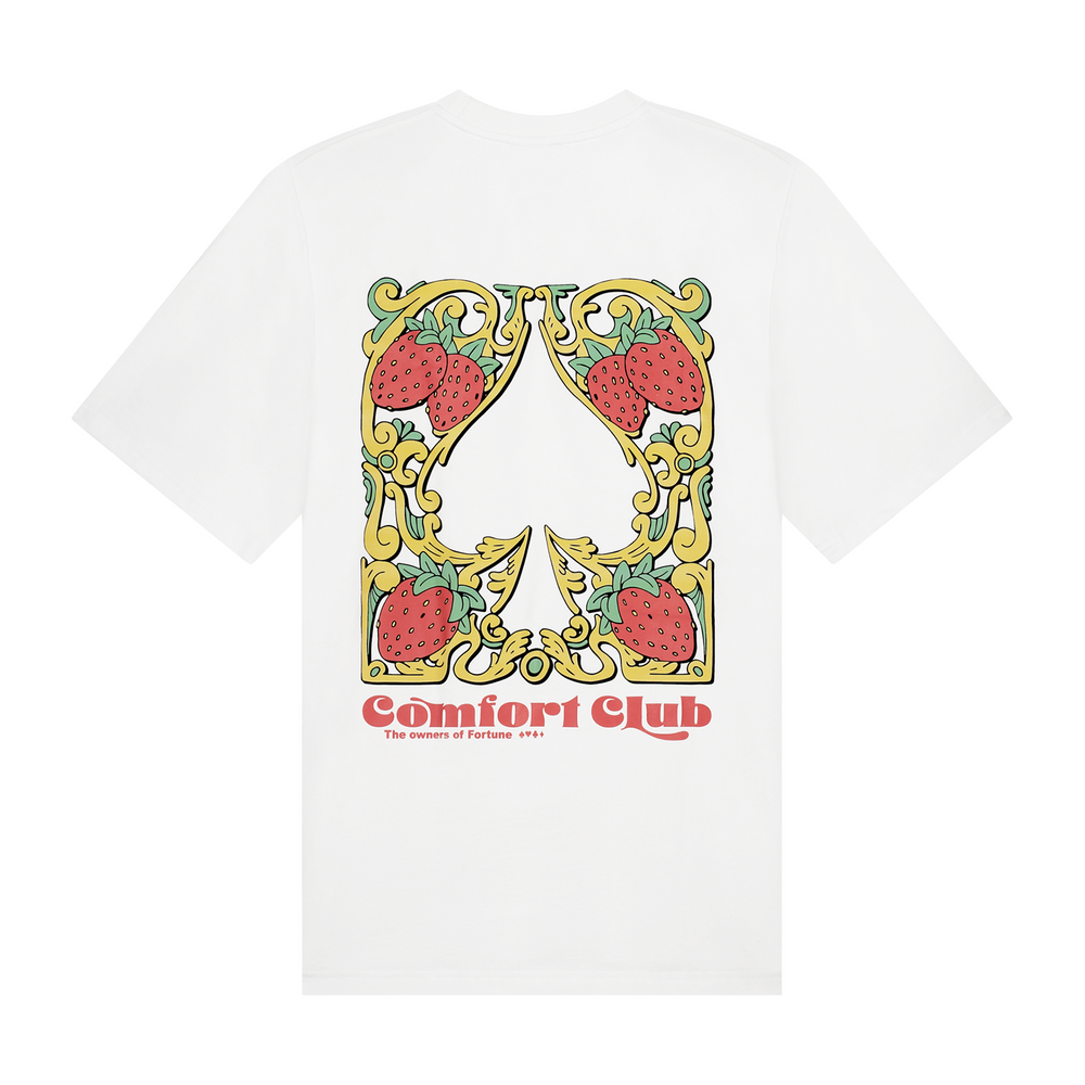 Short sleeve jersey t-shirt in white. Slightly oversized fit in a medium weight cotton. Ribbed crewneck collar. Comfort Club Spadille print graphic to the chest & back.