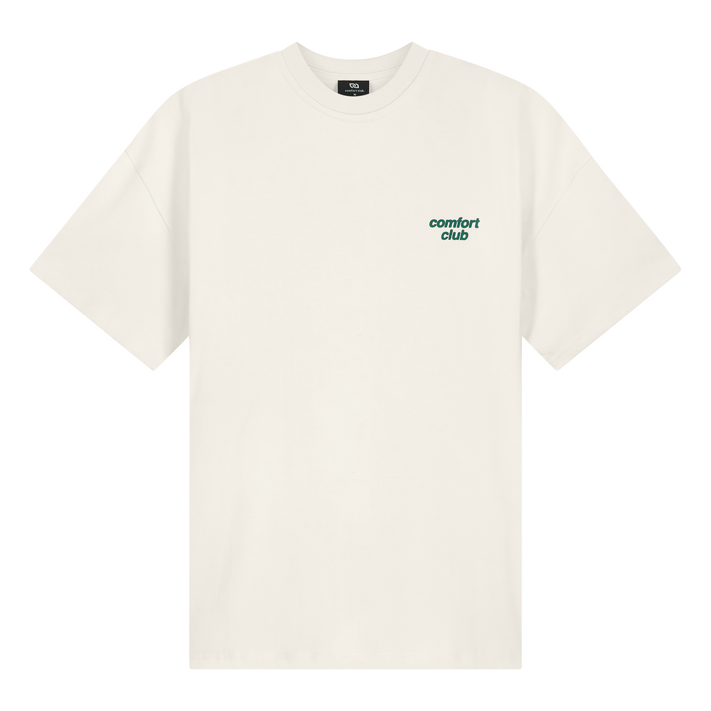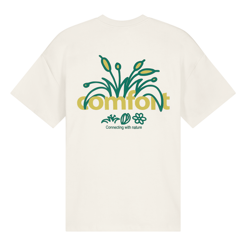 Short sleeve jersey t-shirt in off white. Slightly oversized fit in a medium weight cotton. Ribbed crewneck collar. Comfort Club Typha print graphic to the chest and back.